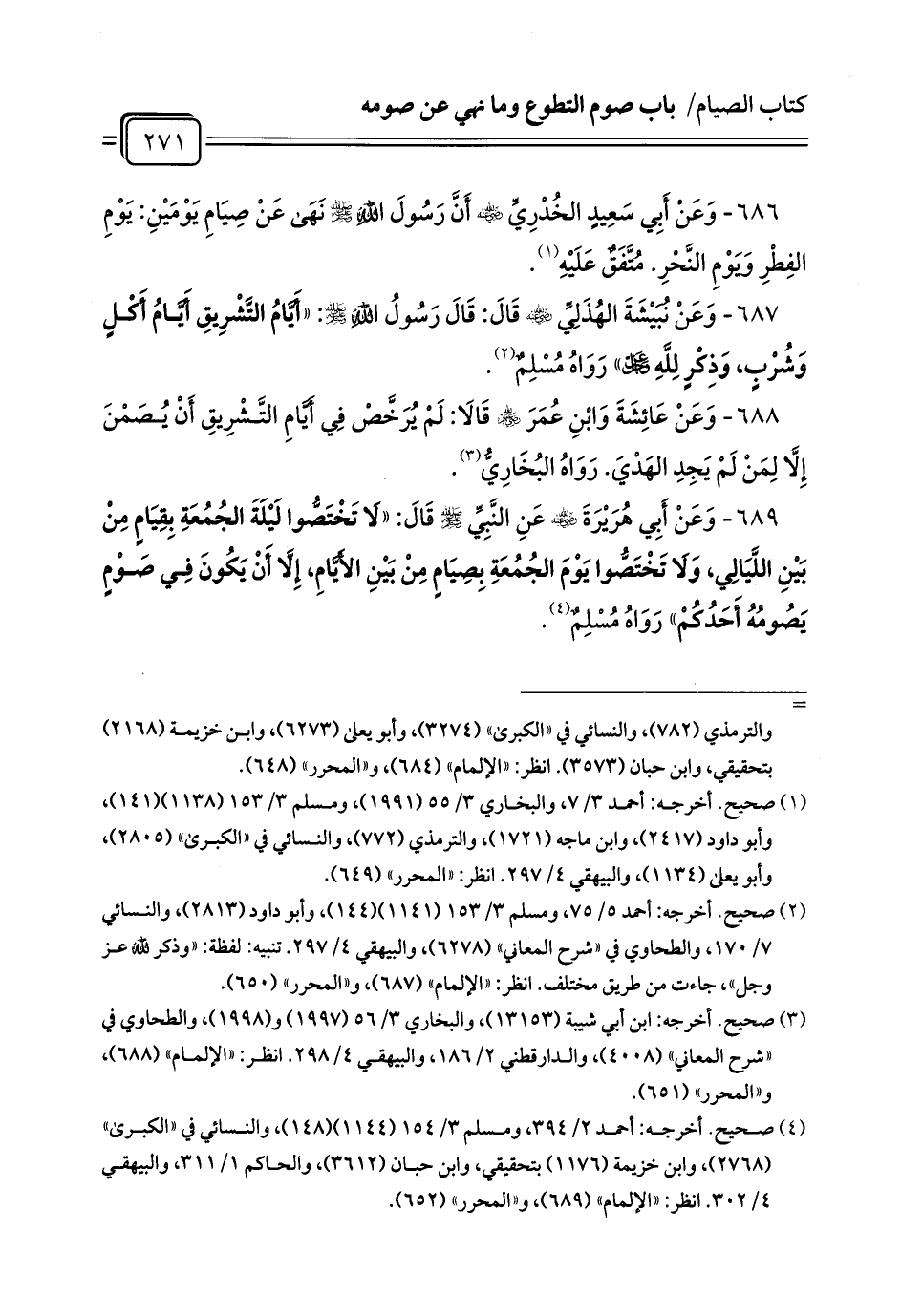 689 - وَعَنْ أَبِي هُرَيْرَةَ - رضي الله عنه - عَنِ النَّبِيِّ - صلى الله عليه وسلم - قَالَ: «لَا تَخْتَصُّوا لَيْلَةَ الجُمُعَةِ بِقِيَامٍ مِنْ بَيْنِ اللَّيَالِي، وَلَا تَخْتَصُّوا يَوْمَ الجُمُعَةِ بِصِيَامٍ مِنْ بَيْنِ الأَيَّامِ، إِلَّا أَنْ يَكُونَ فِي صَوْمٍ يَصُومُهُ أَحَدُكُمْ» رَوَاهُ مُسْلِمٌ (¬1).