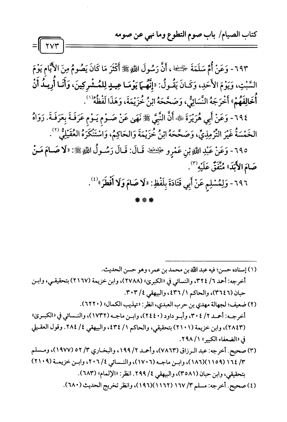 693 - وَعَنْ أُمِّ سَلَمَةَ رَضِيَ اللَّهُ عَنْهَا، أَنَّ رَسُولَ اللَّهِ - صلى الله عليه وسلم - أَكْثَرَ مَا كَانَ يَصُومُ مِنَ الأَيَّامِ يَوْمَ السَّبْتِ، وَيَوْمَ الأَحَدِ، وَكَانَ يَقُولُ: «إِنَّهُمَا يَوْمَا عِيدٍ لِلمُشْرِكِينَ، وَأَنَا أُرِيدُ أَنْ أُخَالِفَهُمْ» أَخْرَجَهُ النَّسَائِيُّ، وَصَحَّحَهُ ابْنُ خُزَيْمَةَ، وَهَذَا لَفْظُهُ (¬1).