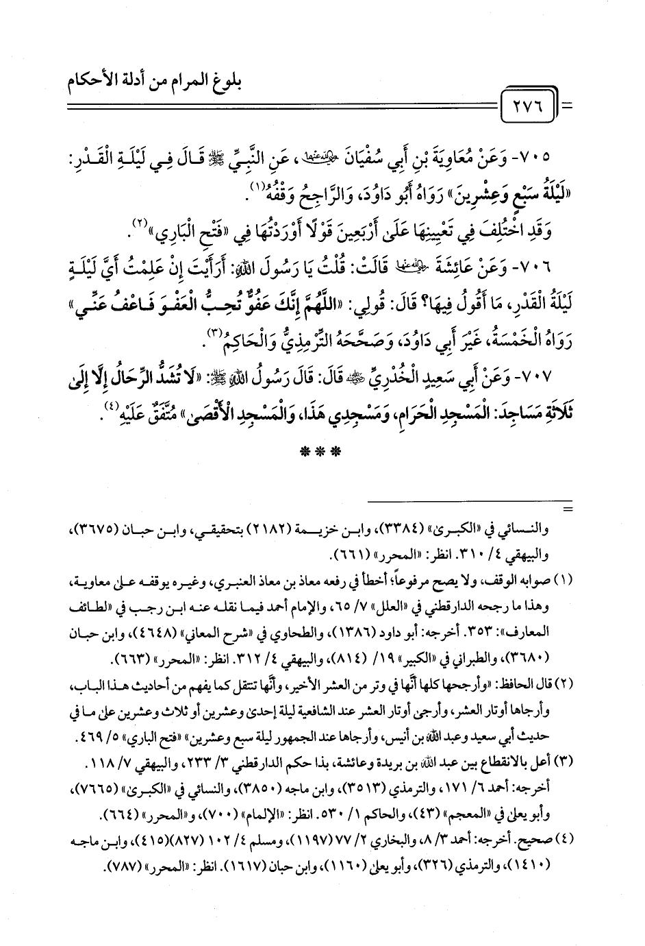 705 - وَعَنْ مُعَاوِيَةَ بْنِ أَبِي سُفْيَانَ رَضِيَ اللَّهُ عَنْهُمَا، عَنِ النَّبِيِّ - صلى الله عليه وسلم - قَالَ فِي لَيْلَةِ الْقَدْرِ: «لَيْلَةُ سَبْعٍ وَعِشْرِينَ» رَوَاهُ أَبُو دَاوُدَ، وَالرَّاجِحُ وَقْفُهُ (¬1).