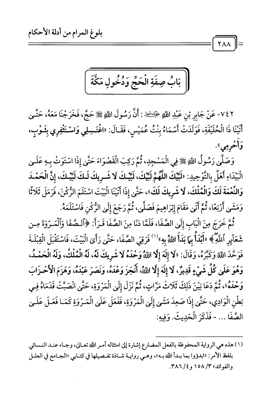 (¬1) هذه هي الرواية المحفوظة بالفعل المضارع إشارة إلى امتثاله أمر الله تعالى، وجاء عند النسائي بلفظ الأمر: «ابدؤوا بما بدأ الله به»، وهي رواية شاذة تفصيلها في كتابي «الجامع في العلل والفوائد» 3/ 158 و 4/ 386.