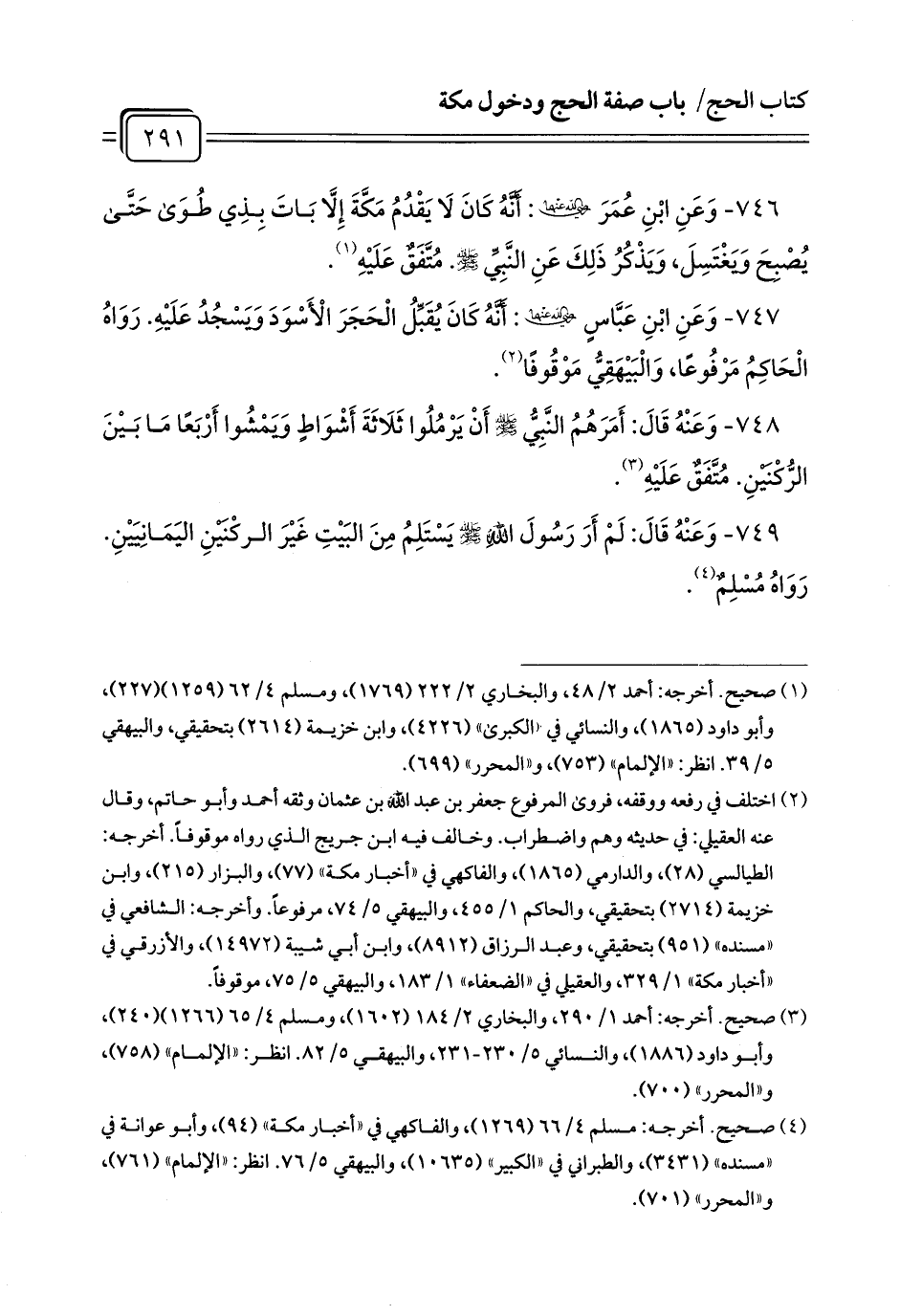 746 - وَعَنِ ابْنِ عُمَرَ رَضِيَ اللَّهُ عَنْهُمَا: أَنَّهُ كَانَ لَا يَقْدُمُ مَكَّةَ إِلَّا بَاتَ بِذِي طُوَى حَتَّى يُصْبِحَ وَيَغْتَسِلَ، وَيَذْكُرُ ذَلِكَ عَنِ النَّبِيِّ - صلى الله عليه وسلم -. مُتَّفَقٌ عَلَيْهِ (¬1).