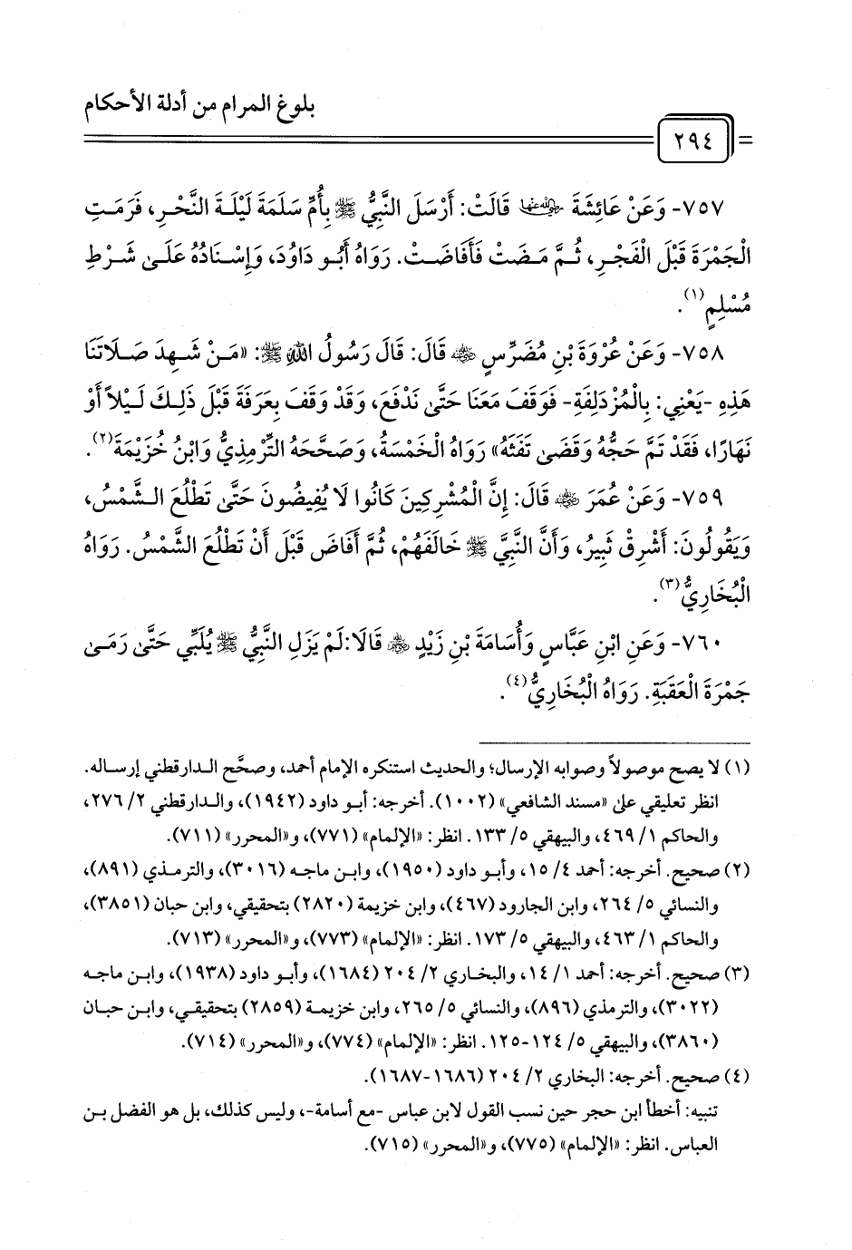 757 - وَعَنْ عَائِشَةَ رَضِيَ اللَّهُ عَنْهَا قَالَتْ: أَرْسَلَ النَّبِيُّ - صلى الله عليه وسلم - بِأُمِّ سَلَمَةَ لَيْلَةَ النَّحْرِ، فَرَمَتِ الْجَمْرَةَ قَبْلَ الْفَجْرِ، ثُمَّ مَضَتْ فَأَفَاضَتْ. رَوَاهُ أَبُو دَاوُدَ، وَإِسْنَادُهُ عَلَى شَرْطِ مُسْلِمٍ (¬1).