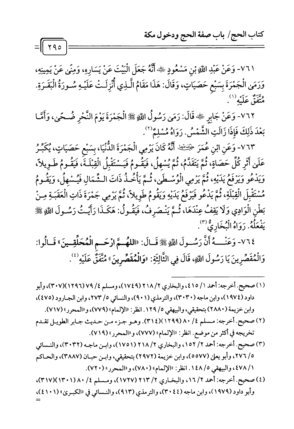 761 - وَعَنْ عَبْدِ اللَّهِ بْنِ مَسْعُودٍ - رضي الله عنه - أَنَّهُ جَعَلَ الْبَيْتَ عَنْ يَسَارِهِ، وَمِنًى عَنْ يَمِينِهِ، وَرَمَى الْجَمْرَةَ بِسَبْعِ حَصَيَاتٍ، وَقَالَ: هَذَا مَقَامُ الَّذِي أُنْزِلَتْ عَلَيْهِ سُورَةُ الْبَقَرَةِ. مُتَّفَقٌ عَلَيْهِ (¬1).