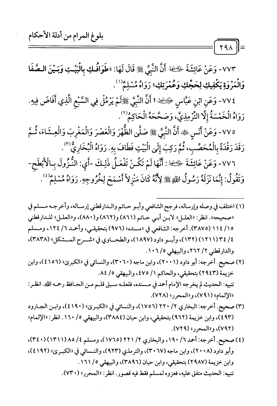773 - وَعَنْ عَائِشَةَ رَضِيَ اللَّهُ عَنْهَا أَنَّ النَّبِيَّ - صلى الله عليه وسلم - قَالَ لَهَا: «طَوَافُكِ بِالْبَيْتِ وَبَيْنَ الصَّفَا وَالْمَرْوَةِ يَكْفِيكِ لِحَجِّكِ وَعُمْرَتِكِ» رَوَاهُ مُسْلِمٌ (¬1).