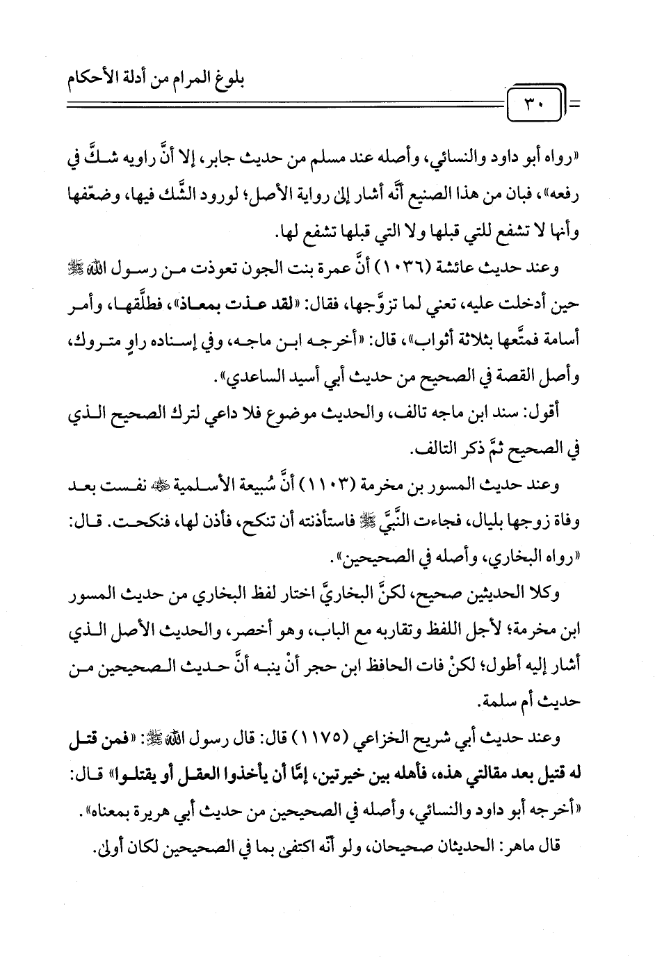 وعند حديث المسور بن مخرمة (1103) أنَّ سُبيعة الأسلمية - رضي الله عنه - نفست بعد وفاة زوجها بليال, فجاءت النَّبيَّ - صلى الله عليه وسلم - فاستأذنته أن تنكح, فأذن لها, فنكحت. قال: «رواه البخاري، وأصله في الصحيحين».