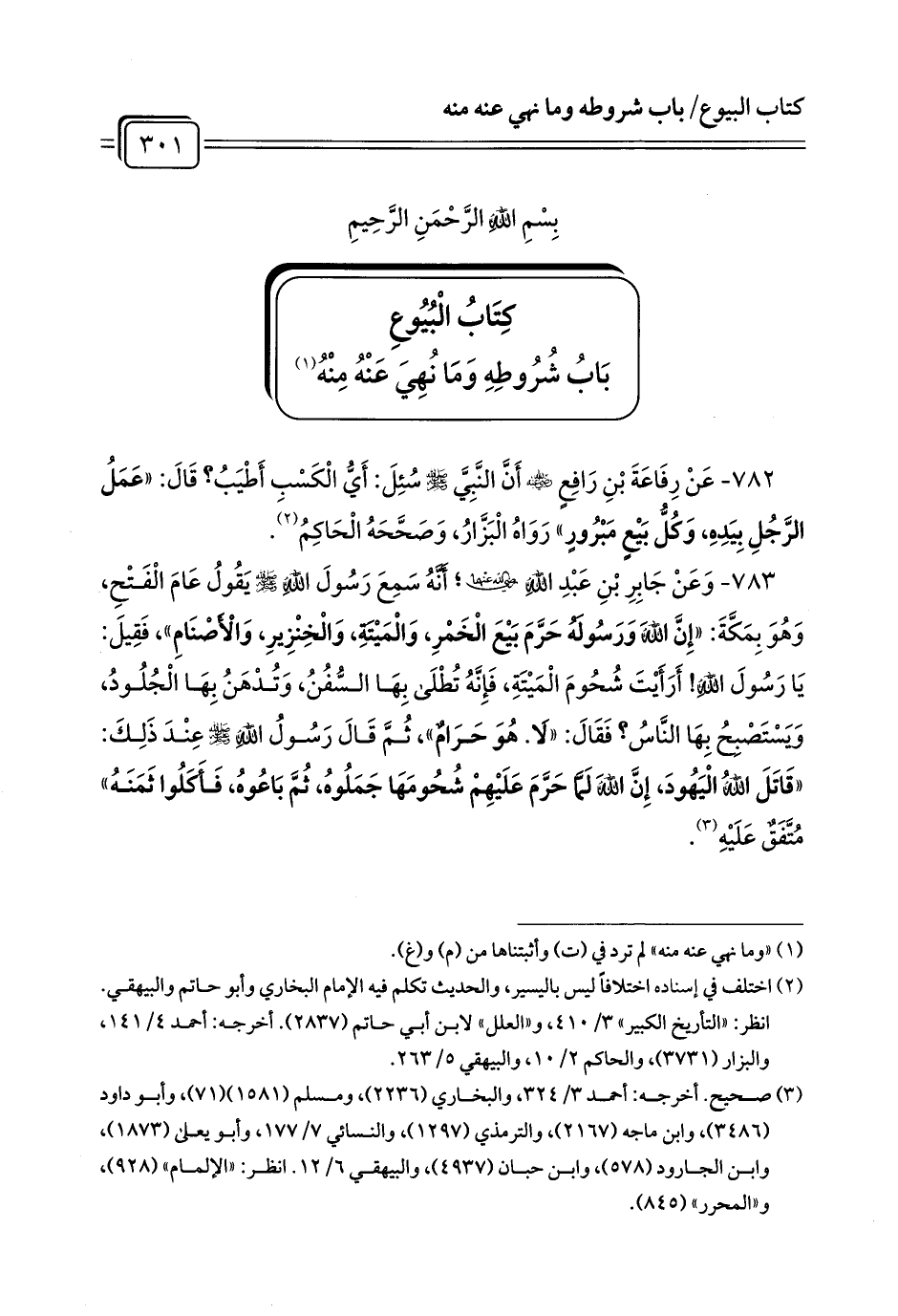 783 - وَعَنْ جَابِرِ بْنِ عَبْدِ اللَّهِ رَضِيَ اللَّهُ عَنْهُمَا; أَنَّهُ سَمِعَ رَسُولَ اللَّهِ - صلى الله عليه وسلم - يَقُولُ عَامَ الْفَتْحِ، وَهُوَ بِمَكَّةَ: «إِنَّ اللَّهَ وَرَسُولَهُ حَرَّمَ بَيْعَ الْخَمْرِ، وَالْمَيْتَةِ، وَالْخِنْزِيرِ، وَالْأَصْنَامِ»، فَقِيلَ: يَا رَسُولَ اللَّهِ! أَرَأَيْتَ شُحُومَ الْمَيْتَةِ، فَإِنَّهُ تُطْلَى بِهَا السُّفُنُ، وَتُدْهَنُ بِهَا الْجُلُودُ، وَيَسْتَصْبِحُ بِهَا النَّاسُ? فَقَالَ: «لَا. هُوَ حَرَامٌ»، ثُمَّ قَالَ رَسُولُ اللَّهِ - صلى الله عليه وسلم - عِنْدَ ذَلِكَ: «قَاتَلَ اللَّهُ الْيَهُودَ، إِنَّ اللَّهَ لَمَّا حَرَّمَ عَلَيْهِمْ شُحُومَهَا جَمَلُوهُ، ثُمَّ بَاعُوهُ، فَأَكَلُوا ثَمَنَهُ» مُتَّفَقٌ عَلَيْهِ (¬1).