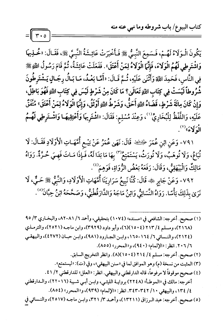 792 - وَعَنْ جَابِرٍ - رضي الله عنه - قَالَ: كُنَّا نَبِيعُ سَرَارِيَنَا أُمَّهَاتِ الْأَوْلَادِ، وَالنَّبِيُّ - صلى الله عليه وسلم - حَيٌّ، لَا نَرَى بِذَلِكَ بَأْسًا. رَوَاهُ النَّسَائِيُّ وَابْنُ مَاجَهْ وَالدَّارَقُطْنِيُّ، وَصَحَّحَهُ ابْنُ حِبَّانَ (¬1).
