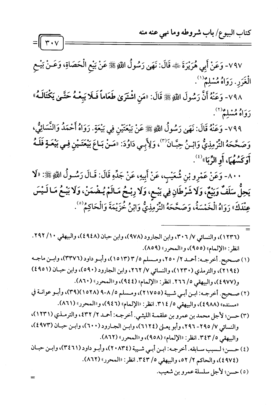 797 - وَعَنْ أَبِي هُرَيْرَةَ - رضي الله عنه - قَالَ: نَهَى رَسُولُ اللَّهِ - صلى الله عليه وسلم - عَنْ بَيْعِ الْحَصَاةِ، وَعَنْ بَيْعِ الْغَرَرِ. رَوَاهُ مُسْلِمٌ (¬1).