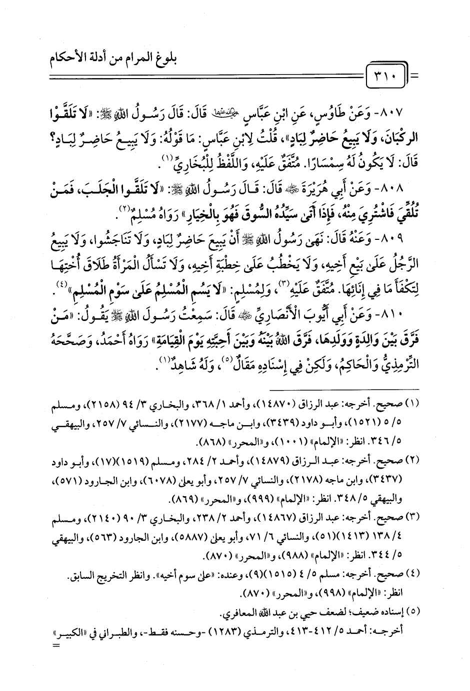808 - وَعَنْ أَبِي هُرَيْرَةَ - رضي الله عنه - قَالَ: قَالَ رَسُولُ اللَّهِ - صلى الله عليه وسلم -: «لَا تَلَقَّوا الْجَلَبَ، فَمَنْ تُلُقِّيَ فَاشْتُرِيَ مِنْهُ، فَإِذَا أَتَى سَيِّدُهُ السُّوقَ فَهُوَ بِالْخِيَارِ» رَوَاهُ مُسْلِمٌ (¬1).