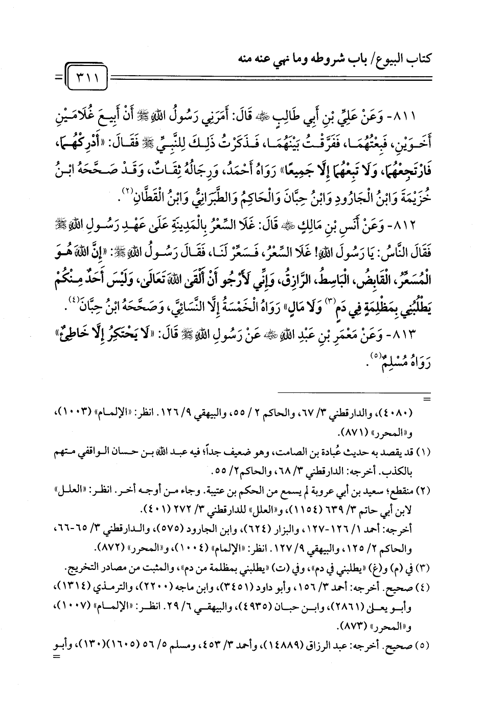 811 - وَعَنْ عَلِيِّ بْنِ أَبِي طَالِبٍ - رضي الله عنه - قَالَ: أَمَرَنِي رَسُولُ اللَّهِ - صلى الله عليه وسلم - أَنْ أَبِيعَ غُلَامَيْنِ أَخَوَيْنِ، فَبِعْتُهُمَا، فَفَرَّقْتُ بَيْنَهُمَا، فَذَكَرْتُ ذَلِكَ لِلنَّبِيِّ - صلى الله عليه وسلم - فَقَالَ: «أَدْرِكْهُمَا، فَارْتَجِعْهُمَا، وَلَا تَبِعْهُمَا إِلَّا جَمِيعًا» رَوَاهُ أَحْمَدُ، وَرِجَالُهُ ثِقَاتٌ، وَقَدْ صَحَّحَهُ ابْنُ خُزَيْمَةَ وَابْنُ الْجَارُودِ وَابْنُ حِبَّانَ وَالْحَاكِمُ وَالطَّبَرَانِيُّ وَابْنُ الْقَطَّانِ (¬1).