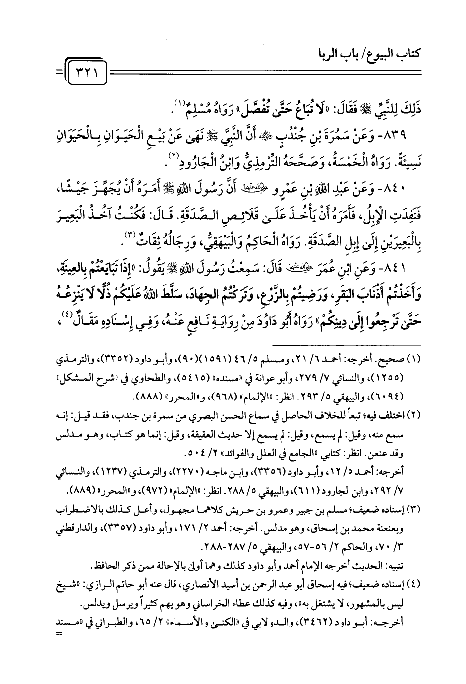 839 - وَعَنْ سَمُرَةَ بْنِ جُنْدُبٍ - رضي الله عنه - أَنَّ النَّبِيَّ - صلى الله عليه وسلم - نَهَى عَنْ بَيْعِ الْحَيَوَانِ بِالْحَيَوَانِ نَسِيئَةً. رَوَاهُ الْخَمْسَةُ، وَصَحَّحَهُ التِّرْمِذِيُّ وَابْنُ الْجَارُودِ (¬1).