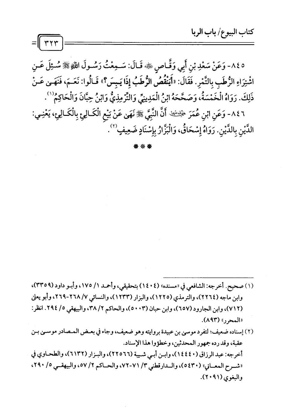 845 - وَعَنْ سَعْدِ بْنِ أَبِي وَقَّاصٍ - رضي الله عنه - قَالَ: سَمِعْتُ رَسُولَ اللَّهِ - صلى الله عليه وسلم - سُئِلَ عَنِ اشْتِرَاءِ الرُّطَبِ بِالتَّمْرِ. فَقَالَ: «أَيَنْقُصُ الرُّطَبُ إِذَا يَبِسَ?» قَالُوا: نَعَمَ، فَنَهَى عَنْ ذَلِكَ. رَوَاهُ الْخَمْسَةُ، وَصَحَّحَهُ ابْنُ الْمَدِينِيِّ وَالتِّرْمِذِيُّ وَابْنُ حِبَّانَ وَالْحَاكِمُ (¬1).