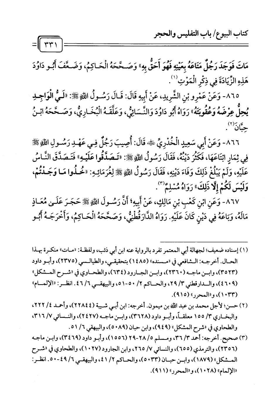 865 - وَعَنْ عَمْرِو بْنِ الشَّرِيدِ، عَنْ أَبِيهِ قَالَ: قَالَ رَسُولُ اللَّهِ - صلى الله عليه وسلم -: «لَيُّ الْوَاجِدِ يُحِلُّ عِرْضَهُ وَعُقُوبَتَهُ» رَوَاهُ أَبُو دَاوُدَ وَالنَّسَائِيُّ، وَعَلَّقَهُ الْبُخَارِيُّ، وَصَحَّحَهُ ابْنُ حِبَّانَ (¬1).