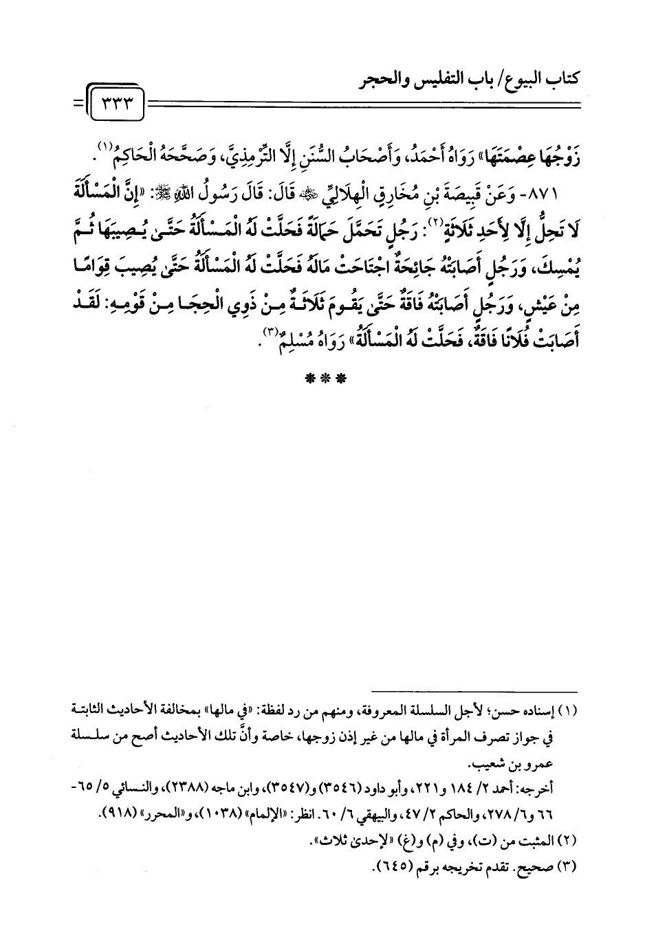 871 - وَعَنْ قَبِيصَةَ بْنِ مُخَارِقٍ الْهِلَالِيِّ - رضي الله عنه - قَالَ: قَالَ رَسُولُ اللَّهِ - صلى الله عليه وسلم -: «إِنَّ الْمَسْأَلَةَ لَا تَحِلُّ إِلَّا لِأَحَدِ ثَلَاثَةٍ (¬1): رَجُلٍ تَحَمَّلَ حَمَالَةً فَحَلَّتْ لَهُ الْمَسْأَلَةُ حَتَّى يُصِيبَهَا ثُمَّ يُمْسِكَ، وَرَجُلٍ أَصَابَتْهُ جَائِحَةٌ اجْتَاحَتْ مَالَهُ فَحَلَّتْ لَهُ الْمَسْأَلَةُ حَتَّى يُصِيبَ قِوَامًا مِنْ عَيْشٍ، وَرَجُلٍ أَصَابَتْهُ فَاقَةٌ حَتَّى يَقُومَ ثَلَاثَةٌ مِنْ ذَوِي الْحِجَا مِنْ قَوْمِهِ: لَقَدْ أَصَابَتْ فُلَانًا فَاقَةٌ، فَحَلَّتْ لَهُ الْمَسْأَلَةُ» رَوَاهُ مُسْلِمٌ (¬2).