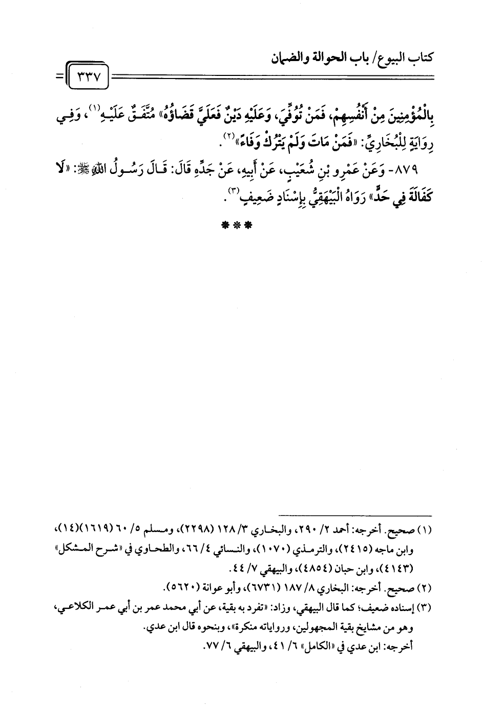 879 - وَعَنْ عَمْرِو بْنِ شُعَيْبٍ، عَنْ أَبِيهِ، عَنْ جَدِّهِ قَالَ: قَالَ رَسُولُ اللَّهِ - صلى الله عليه وسلم -: «لَا كَفَالَةَ فِي حَدٍّ» رَوَاهُ الْبَيْهَقِيُّ بِإِسْنَادٍ ضَعِيفٍ (¬1).