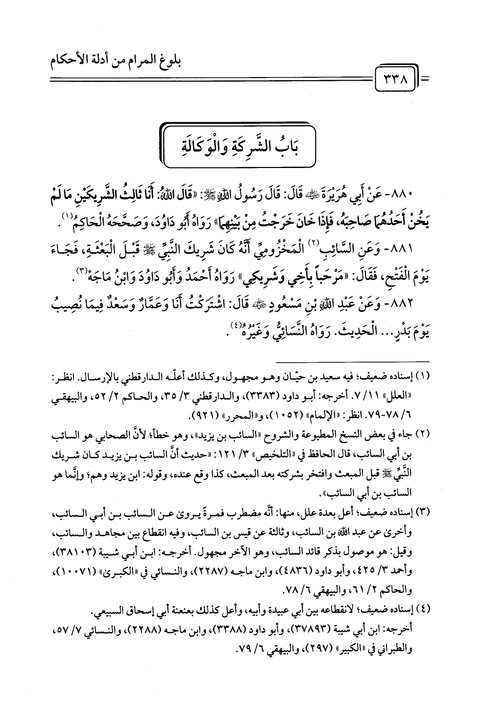 880 - عَنْ أَبِي هُرَيْرَةَ - رضي الله عنه - قَالَ: قَالَ رَسُولُ اللَّهِ - صلى الله عليه وسلم -: «قَالَ اللَّهُ: أَنَا ثَالِثُ الشَّرِيكَيْنِ مَا لَمْ يَخُنْ أَحَدُهُمَا صَاحِبَهُ، فَإِذَا خَانَ خَرَجْتُ مِنْ بَيْنِهِمَا» رَوَاهُ أَبُو دَاوُدَ، وَصَحَّحَهُ الْحَاكِمُ (¬1).