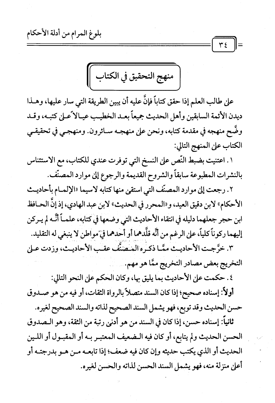 2 - رجعت إلى موارد المصنّف التي استقى منها كتابه لا سيما «الإلمام بأحاديث الأحكام» لابن دقيق العيد، و «المحرر في الحديث» لابن عبد الهادي, إذ إنَّ الحافظ ابن حجر جعلهما دليله في انتقاء الأحاديث التي وضعها في كتابه، علماً أنَّه لم يركن إليهما ركوناً كلياً، على الرغم من أنَّه قلَّدهما أو أحدهما في مواطن لا ينبغي له التقليد.