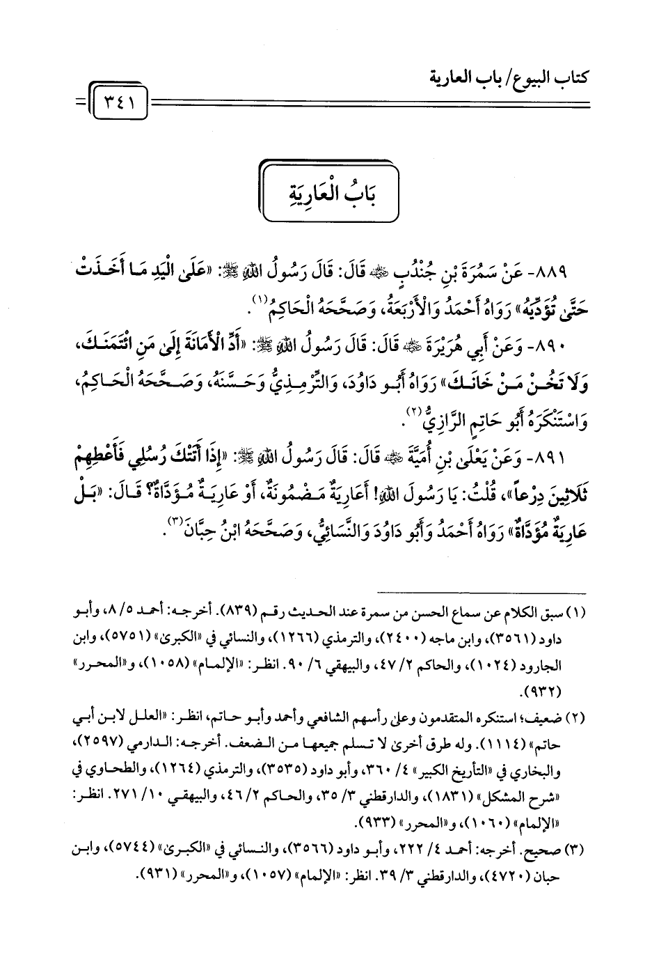 891 - وَعَنْ يَعْلَى بْنِ أُمَيَّةَ - رضي الله عنه - قَالَ: قَالَ رَسُولُ اللَّهِ - صلى الله عليه وسلم -: «إِذَا أَتَتْكَ رُسُلِي فَأَعْطِهِمْ ثَلَاثِينَ دِرْعاً»، قُلْتُ: يَا رَسُولَ اللَّهِ! أَعَارِيَةٌ مَضْمُونَةٌ، أَوْ عَارِيَةٌ مُؤَدَّاةٌ? قَالَ: «بَلْ عَارِيَةٌ مُؤَدَّاةٌ» رَوَاهُ أَحْمَدُ وَأَبُو دَاوُدَ وَالنَّسَائِيُّ، وَصَحَّحَهُ ابْنُ حِبَّانَ (¬1).