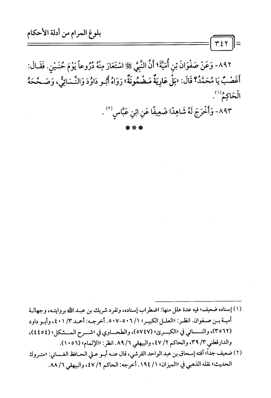 892 - وَعَنْ صَفْوَانَ بْنِ أُمَيَّةَ; أَنَّ النَّبِيَّ - صلى الله عليه وسلم - اسْتَعَارَ مِنْهُ دُرُوعاً يَوْمَ حُنَيْنٍ. فَقَالَ: أَغَصْبٌ يَا مُحَمَّدُ? قَالَ: «بَلْ عَارِيَةٌ مَضْمُونَةٌ» رَوَاهُ أَبُو دَاوُدَ وَالنَّسَائِيُّ، وَصَحَّحَهُ الْحَاكِمُ (¬1).