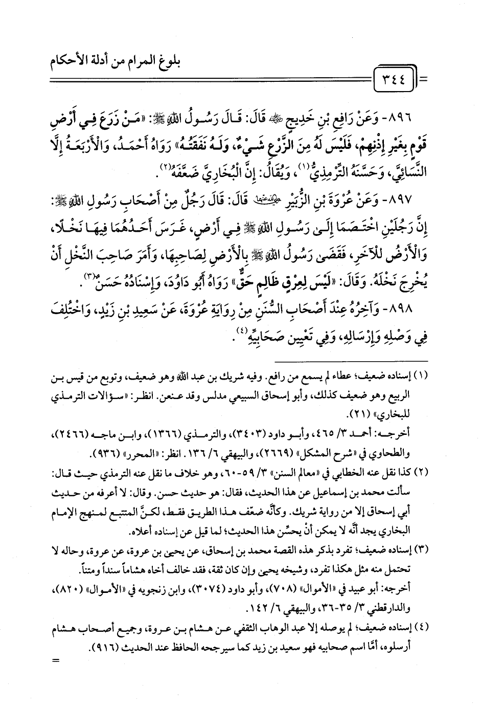 896 - وَعَنْ رَافِعِ بْنِ خَدِيجٍ - رضي الله عنه - قَالَ: قَالَ رَسُولُ اللَّهِ - صلى الله عليه وسلم -: «مَنْ زَرَعَ فِي أَرْضِ قَوْمٍ بِغَيْرِ إِذْنِهِمْ، فَلَيْسَ لَهُ مِنَ الزَّرْعِ شَيْءٌ، وَلَهُ نَفَقَتُهُ» رَوَاهُ أَحْمَدُ، وَالْأَرْبَعَةُ إِلَّا النَّسَائِيَّ، وَحَسَّنَهُ التِّرْمِذِيُّ (¬1)، وَيُقَالُ: إِنَّ الْبُخَارِيَّ ضَعَّفَهُ (¬2).