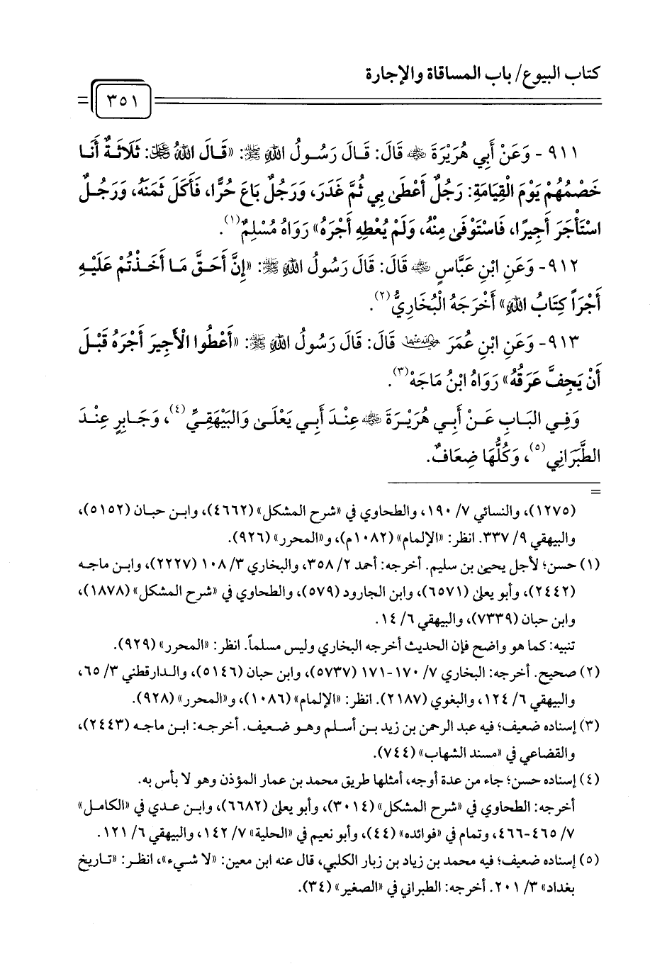 911 - وَعَنْ أَبِي هُرَيْرَةَ - رضي الله عنه - قَالَ: قَالَ رَسُولُ اللَّهِ - صلى الله عليه وسلم -: «قَالَ اللَّهُ - عز وجل -: ثَلَاثَةٌ أَنَا خَصْمُهُمْ يَوْمَ الْقِيَامَةِ: رَجُلٌ أَعْطَى بِي ثُمَّ غَدَرَ، وَرَجُلٌ بَاعَ حُرًّا، فَأَكَلَ ثَمَنَهُ، وَرَجُلٌ اسْتَأْجَرَ أَجِيرًا، فَاسْتَوْفَى مِنْهُ، وَلَمْ يُعْطِهِ أَجْرَهُ» رَوَاهُ مُسْلِمٌ (¬1).