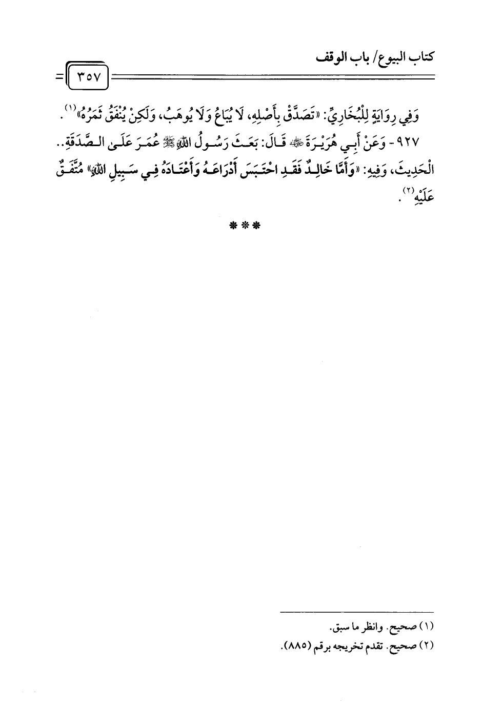 927 - وَعَنْ أَبِي هُرَيْرَةَ - رضي الله عنه - قَالَ: بَعَثَ رَسُولُ اللَّهِ - صلى الله عليه وسلم - عُمَرَ عَلَى الصَّدَقَةِ .. الْحَدِيثَ، وَفِيهِ: «وَأَمَّا خَالِدٌ فَقَدِ احْتَبَسَ أَدْرَاعَهُ وَأَعْتَادَهُ فِي سَبِيلِ اللَّهِ» مُتَّفَقٌ عَلَيْهِ (¬1).