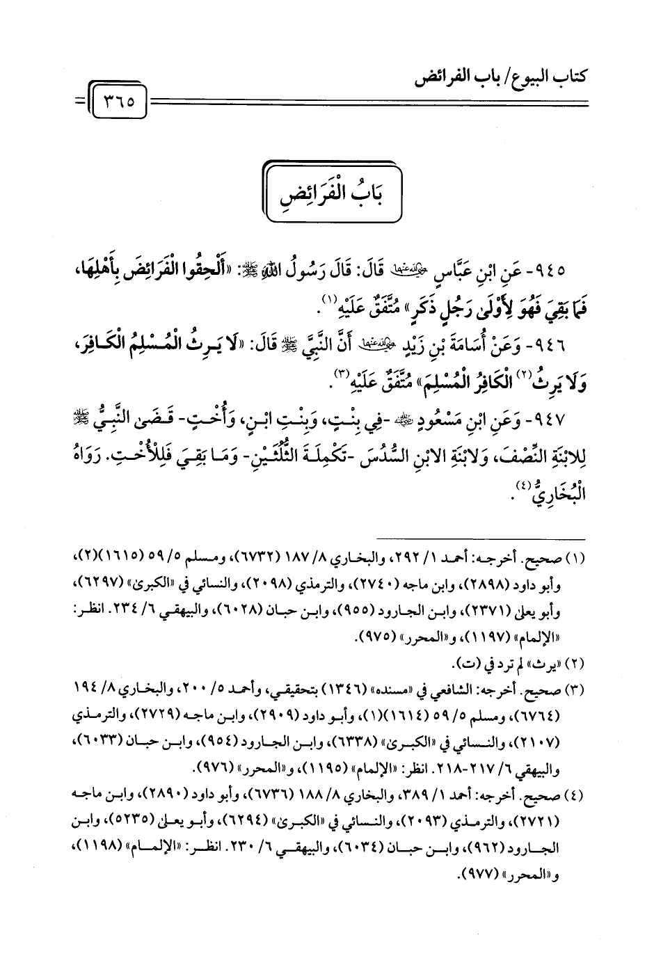 945 - عَنِ ابْنِ عَبَّاسٍ رَضِيَ اللَّهُ عَنْهُمَا قَالَ: قَالَ رَسُولُ اللَّهِ - صلى الله عليه وسلم -: «أَلْحِقُوا الْفَرَائِضَ بِأَهْلِهَا، فَمَا بَقِيَ فَهُوَ لِأَوْلَى رَجُلٍ ذَكَرٍ» مُتَّفَقٌ عَلَيْهِ (¬1).