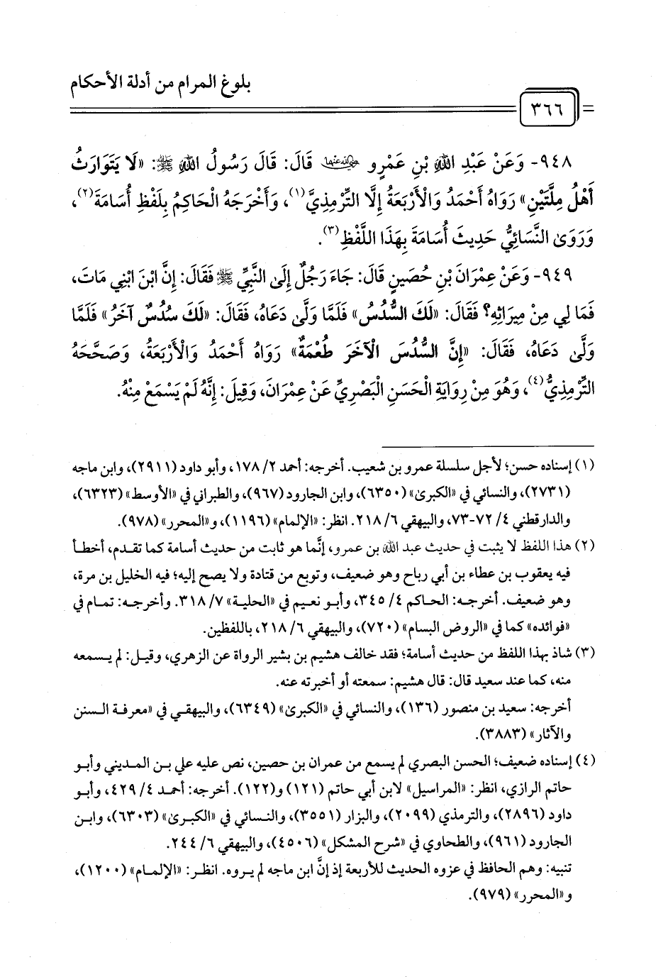 949 - وَعَنْ عِمْرَانَ بْنِ حُصَينٍ قَالَ: جَاءَ رَجُلٌ إِلَى النَّبِيِّ - صلى الله عليه وسلم - فَقَالَ: إِنَّ ابْنَ ابْنِي مَاتَ، فَمَا لِي مِنْ مِيرَاثِهِ? فَقَالَ: «لَكَ السُّدُسُ» فَلَمَّا وَلَّى دَعَاهُ، فَقَالَ: «لَكَ سُدُسٌ آخَرُ» فَلَمَّا وَلَّى دَعَاهُ، فَقَالَ: «إِنَّ السُّدُسَ الْآخَرَ طُعْمَةٌ» رَوَاهُ أَحْمَدُ وَالْأَرْبَعَةُ، وَصَحَّحَهُ التِّرْمِذِيُّ (¬1)، وَهُوَ مِنْ رِوَايَةِ الْحَسَنِ الْبَصْرِيِّ عَنْ عِمْرَانَ، وَقِيلَ: إِنَّهُ لَمْ يَسْمَعْ مِنْهُ.