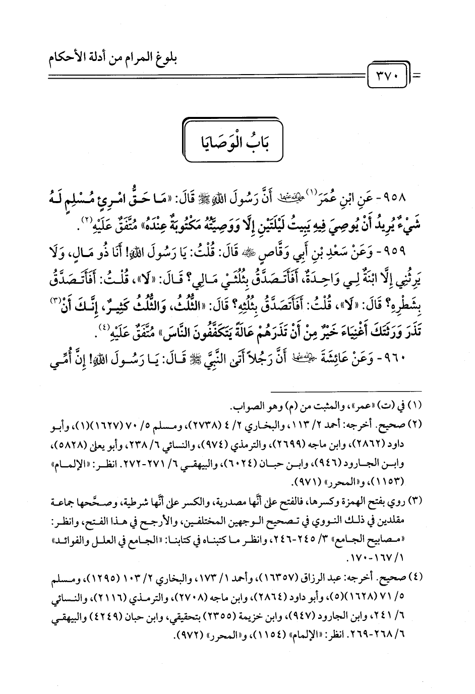 958 - عَنِ ابْنِ عُمَرَ (¬1) رَضِيَ اللَّهُ عَنْهُمَا أَنَّ رَسُولَ اللَّهِ - صلى الله عليه وسلم - قَالَ: «مَا حَقُّ امْرِئٍ مُسْلِمٍ لَهُ شَيْءٌ يُرِيدُ أَنْ يُوصِيَ فِيهِ يَبِيتُ لَيْلَتَيْنِ إِلَّا وَوَصِيَّتُهُ مَكْتُوبَةٌ عِنْدَهُ» مُتَّفَقٌ عَلَيْهِ (¬2).