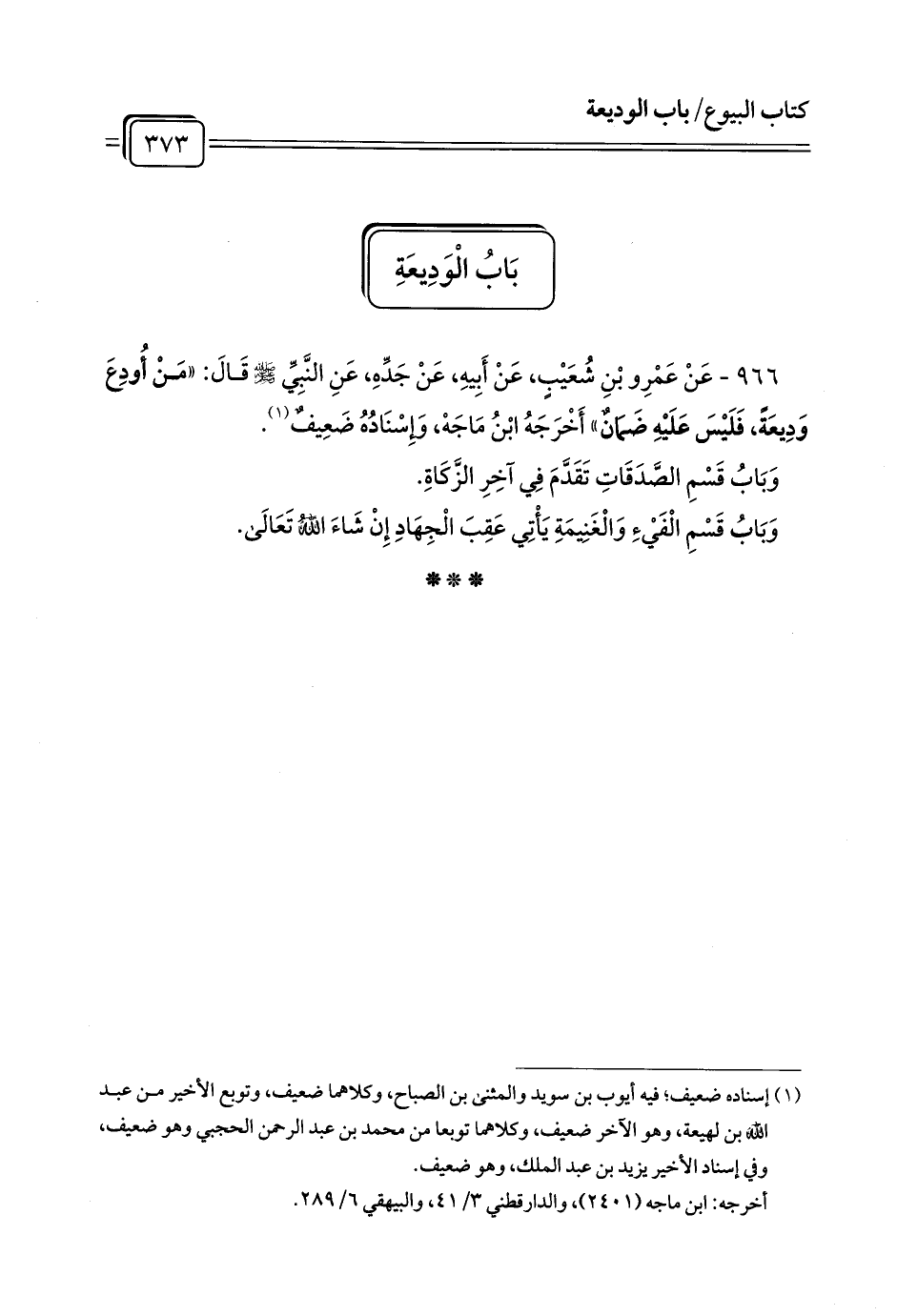 966 - عَنْ عَمْرِو بْنِ شُعَيْبٍ، عَنْ أَبِيهِ، عَنْ جَدِّهِ، عَنِ النَّبِيِّ - صلى الله عليه وسلم - قَالَ: «مَنْ أُودِعَ وَدِيعَةً، فَلَيْسَ عَلَيْهِ ضَمَانٌ» أَخْرَجَهُ ابْنُ مَاجَهْ، وَإِسْنَادُهُ ضَعِيفٌ (¬1).