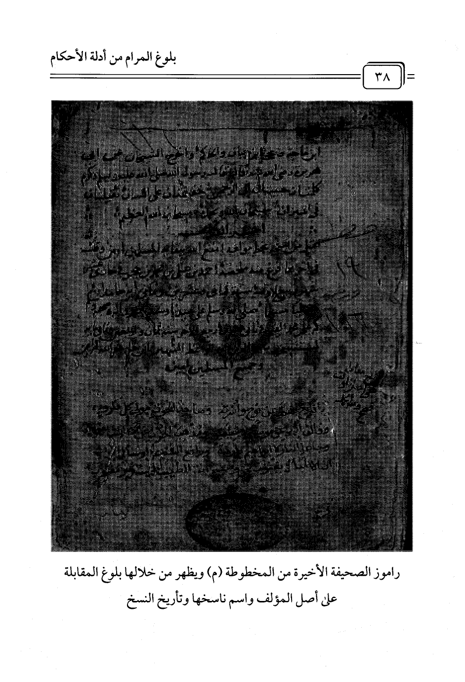 راموز الصحيفة الأخيرة من المخطوطة (م) ويظهر من خلالها بلوغ المقابلة على أصل المؤلف واسم ناسخها وتأريخ النسخ