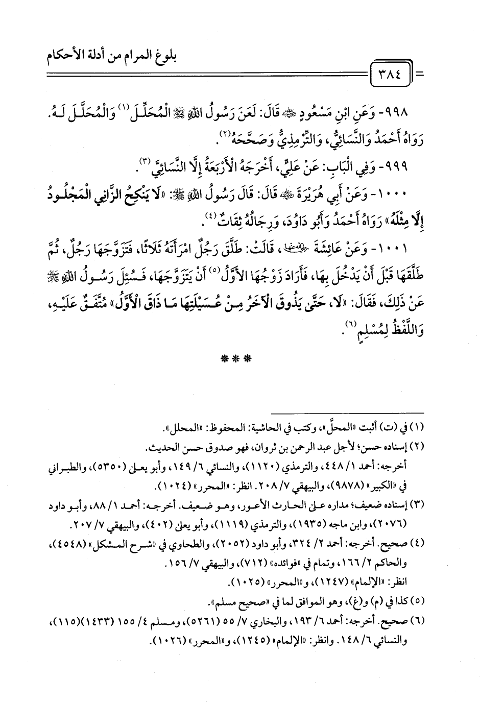 998 - وَعَنِ ابْنِ مَسْعُودٍ - رضي الله عنه - قَالَ: لَعَنَ رَسُولُ اللَّهِ - صلى الله عليه وسلم - الْمُحَلِّلَ (¬1) وَالْمُحَلَّلَ لَهُ. رَوَاهُ أَحْمَدُ وَالنَّسَائِيُّ، وَالتِّرْمِذِيُّ وَصَحَّحَهُ (¬2).