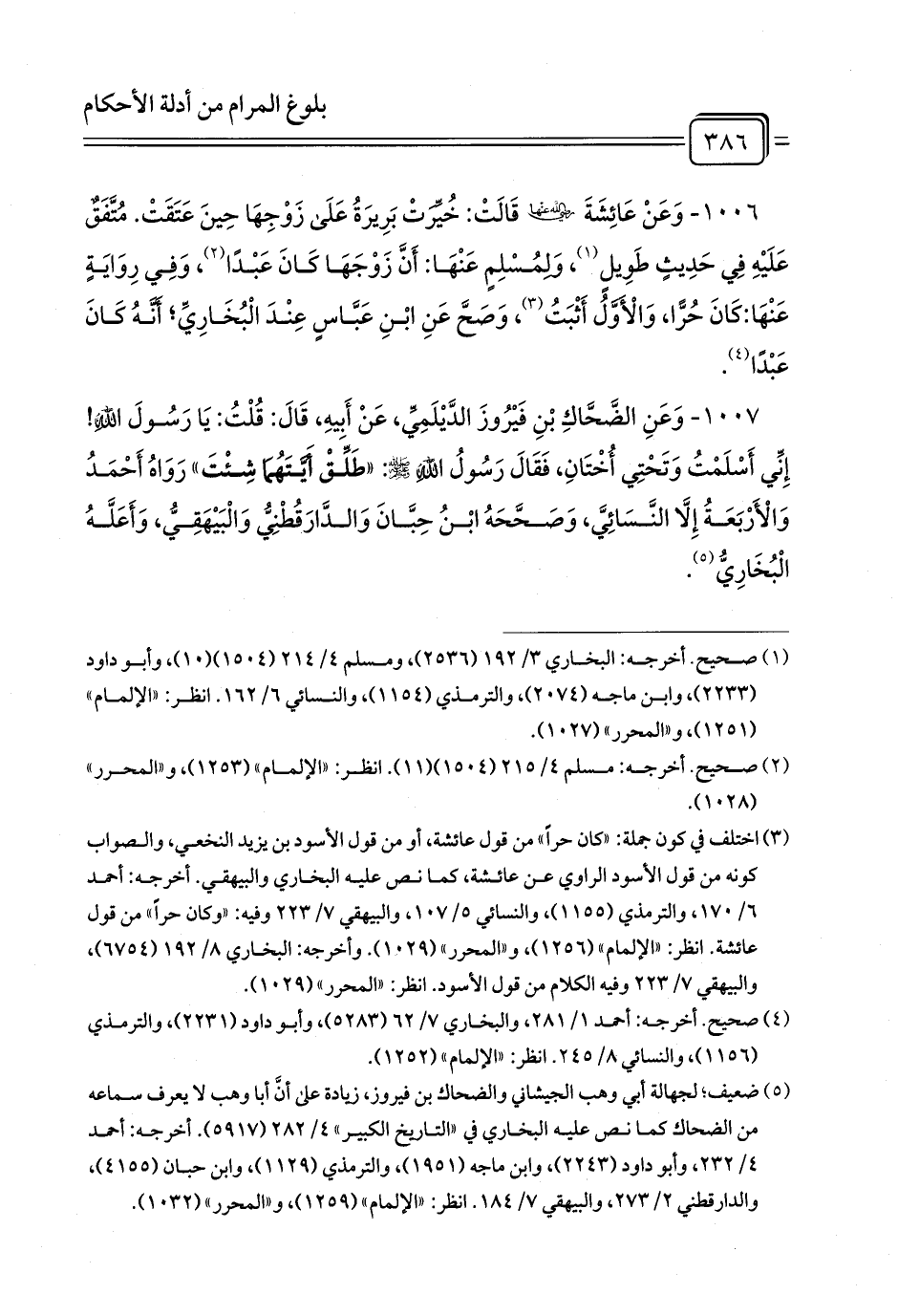 1006 - وَعَنْ عَائِشَةَ رَضِيَ اللَّهُ عَنْهَا قَالَتْ: خُيِّرَتْ بَرِيرَةُ عَلَى زَوْجِهَا حِينَ عَتَقَتْ. مُتَّفَقٌ عَلَيْهِ فِي حَدِيثٍ طَوِيلٍ (¬1)، وَلِمُسْلِمٍ عَنْهَا: أَنَّ زَوْجَهَا كَانَ عَبْدًا (¬2)، وَفِي رِوَايَةٍ عَنْهَا: كَانَ حُرًّا، وَالْأَوَّلُ أَثْبَتُ (¬3)،