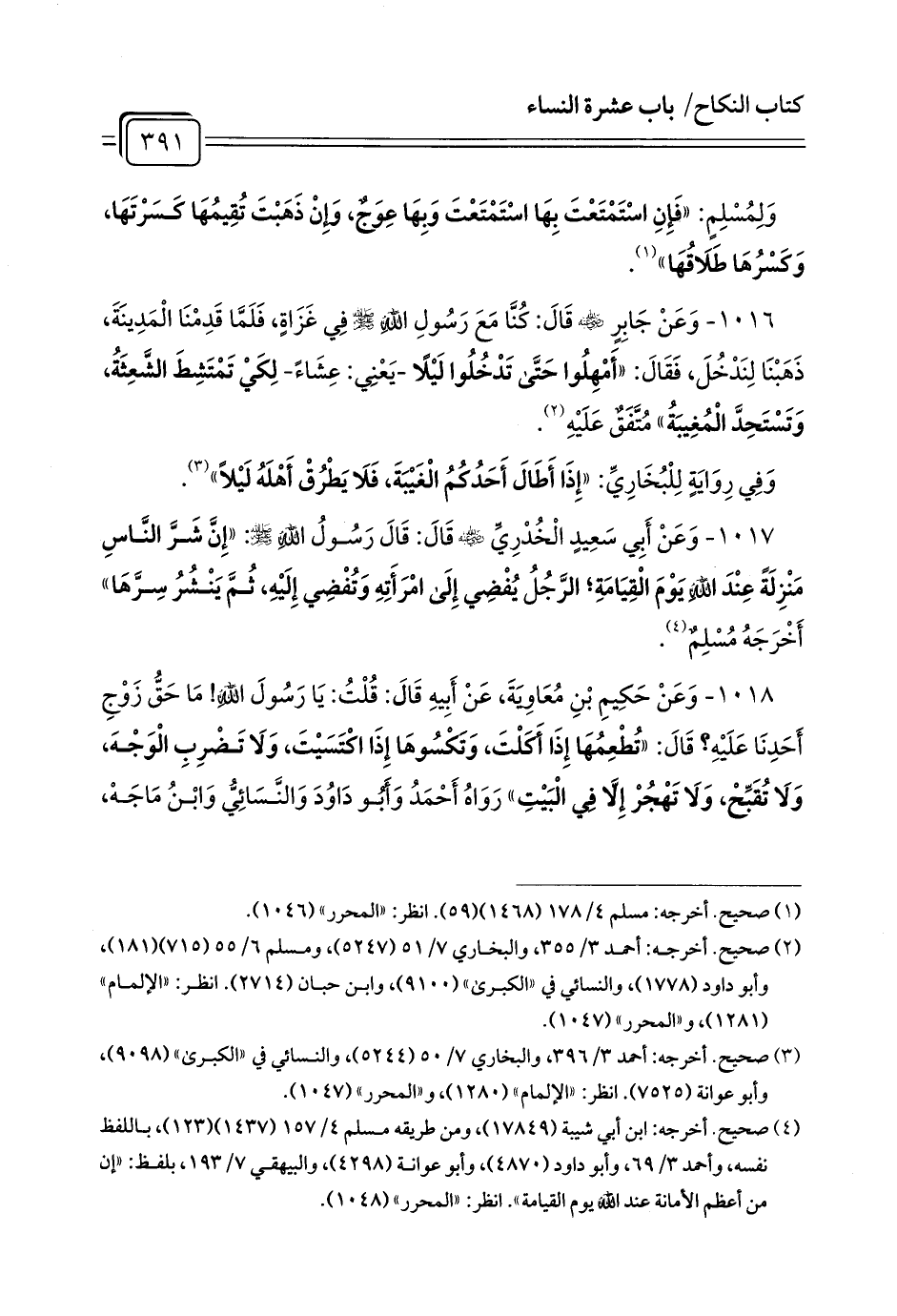1018 - وَعَنْ حَكِيمِ بْنِ مُعَاوِيَةَ، عَنْ أَبِيهِ قَالَ: قُلْتُ: يَا رَسُولَ اللَّهِ! مَا حَقُّ زَوْجِ أَحَدِنَا عَلَيْهِ? قَالَ: «تُطْعِمُهَا إِذَا أَكَلْتَ، وَتَكْسُوهَا إِذَا اكْتَسَيْتَ، وَلَا تَضْرِبِ الْوَجْهَ، وَلَا تُقَبِّحْ، وَلَا تَهْجُرْ إِلَّا فِي الْبَيْتِ» رَوَاهُ أَحْمَدُ وَأَبُو دَاوُدَ وَالنَّسَائِيُّ وَابْنُ مَاجَهْ،