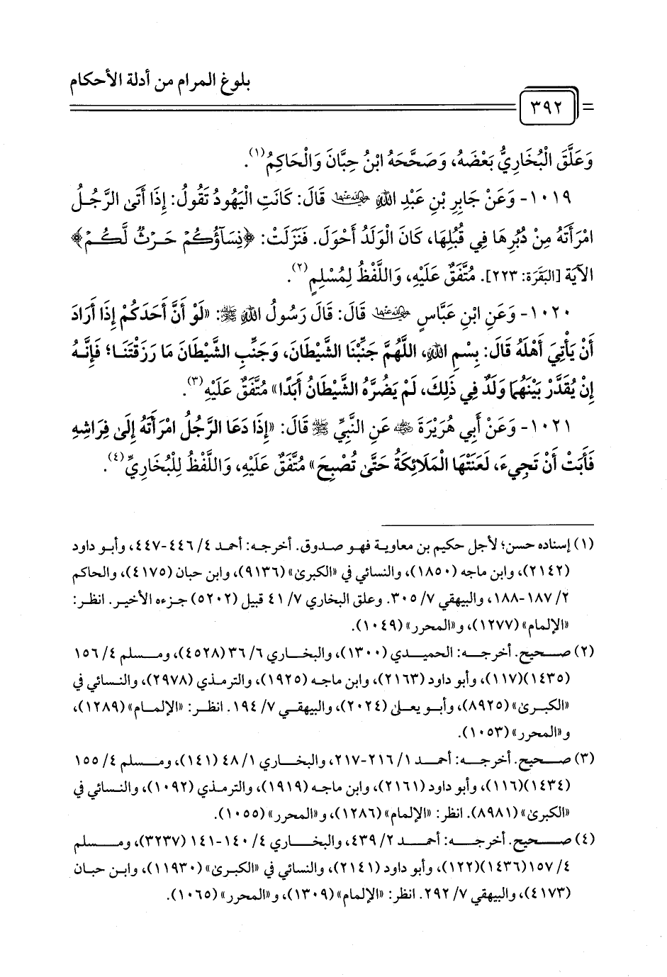 1021 - وَعَنْ أَبِي هُرَيْرَةَ - رضي الله عنه - عَنِ النَّبِيِّ - صلى الله عليه وسلم - قَالَ: «إِذَا دَعَا الرَّجُلُ امْرَأَتَهُ إِلَى فِرَاشِهِ فَأَبَتْ أَنْ تَجِيءَ، لَعَنَتْهَا الْمَلَائِكَةُ حَتَّى تُصْبِحَ» مُتَّفَقٌ عَلَيْهِ، وَاللَّفْظُ لِلْبُخَارِيِّ (¬1).