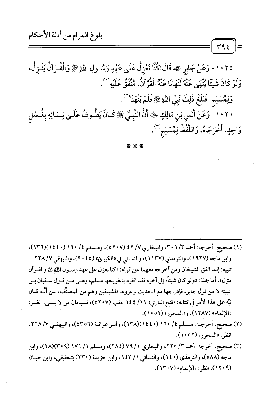 1026 - وَعَنْ أَنَسِ بْنِ مَالِكٍ - رضي الله عنه - أَنَّ النَّبِيَّ - صلى الله عليه وسلم - كَانَ يَطُوفُ عَلَى نِسَائِهِ بِغُسْلٍ وَاحِدٍ. أَخْرَجَاهُ، وَاللَّفْظُ لِمُسْلِمٍ (¬1).
