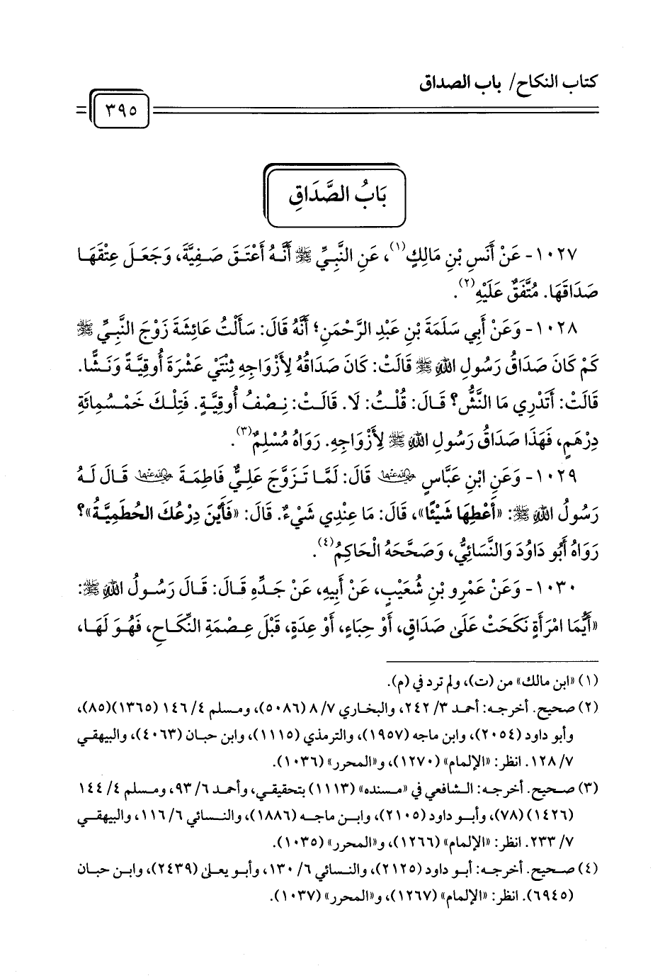 1027 - عَنْ أَنَسِ بْنِ مَالِكٍ (¬1)، عَنِ النَّبِيِّ - صلى الله عليه وسلم - أَنَّهُ أَعْتَقَ صَفِيَّةَ، وَجَعَلَ عِتْقَهَا صَدَاقَهَا. مُتَّفَقٌ عَلَيْهِ (¬2).