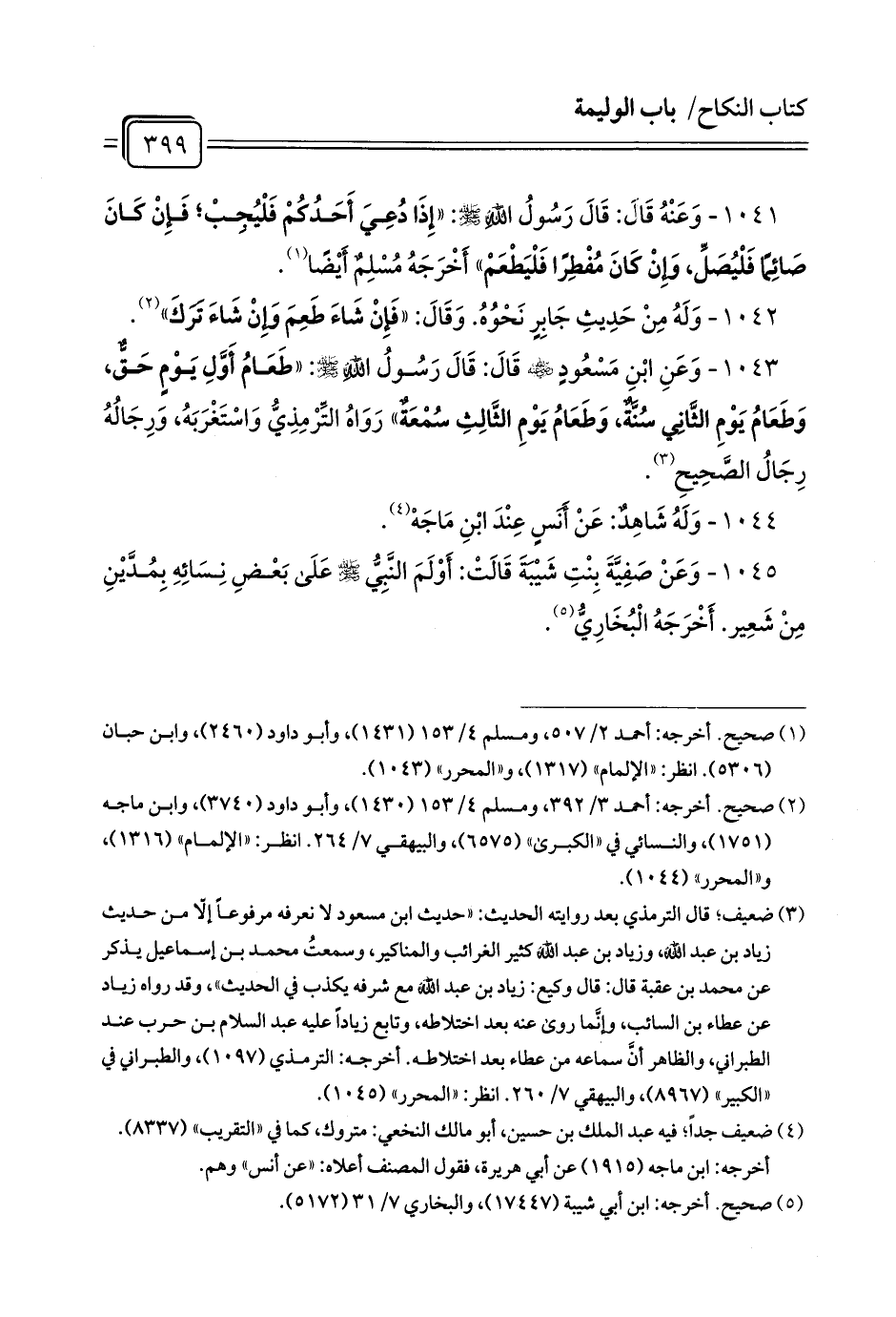 1043 - وَعَنِ ابْنِ مَسْعُودٍ - رضي الله عنه - قَالَ: قَالَ رَسُولُ اللَّهِ - صلى الله عليه وسلم -: «طَعَامُ أَوَّلِ يَوْمٍ حَقٌّ، وَطَعَامُ يَوْمِ الثَّانِي سُنَّةٌ، وَطَعَامُ يَوْمِ الثَّالِثِ سُمْعَةٌ» رَوَاهُ التِّرْمِذِيُّ وَاسْتَغْرَبَهُ، وَرِجَالُهُ رِجَالُ الصَّحِيحِ (¬1).