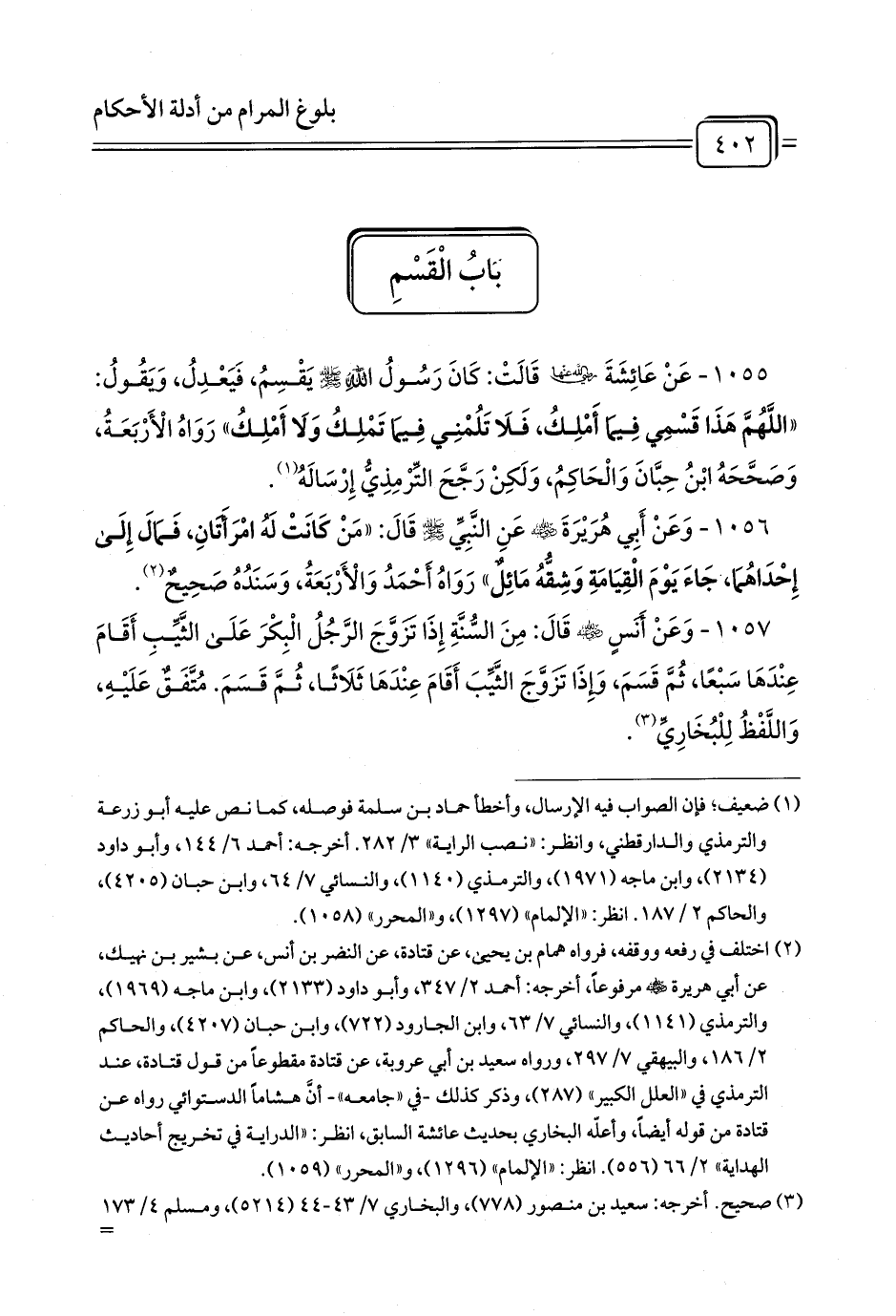 1055 - عَنْ عَائِشَةَ رَضِيَ اللَّهُ عَنْهَا قَالَتْ: كَانَ رَسُولُ اللَّهِ - صلى الله عليه وسلم - يَقْسِمُ، فَيَعْدِلُ، وَيَقُولُ: «اللَّهُمَّ هَذَا قَسْمِي فِيمَا أَمْلِكُ، فَلَا تَلُمْنِي فِيمَا تَمْلِكُ وَلَا أَمْلِكُ» رَوَاهُ الْأَرْبَعَةُ، وَصَحَّحَهُ ابْنُ حِبَّانَ وَالْحَاكِمُ، وَلَكِنْ رَجَّحَ التِّرْمِذِيُّ إِرْسَالَهُ (¬1).