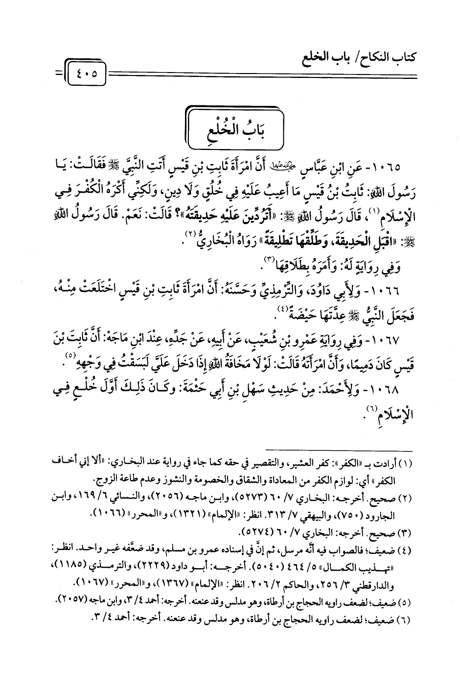 1065 - عَنِ ابْنِ عَبَّاسٍ رَضِيَ اللَّهُ عَنْهُمَا أَنَّ امْرَأَةَ ثَابِتِ بْنِ قَيْسٍ أَتَتِ النَّبِيَّ - صلى الله عليه وسلم - فَقَالَتْ: يَا رَسُولَ اللَّهِ: ثَابِتُ بْنُ قَيْسٍ مَا أَعِيبُ عَلَيْهِ فِي خُلُقٍ وَلَا دِينٍ، وَلَكِنِّي أَكْرَهُ الْكُفْرَ فِي الْإِسْلَامِ (¬1)، قَالَ رَسُولُ اللَّهِ - صلى الله عليه وسلم -: «أَتَرُدِّينَ عَلَيْهِ حَدِيقَتَهُ» ? قَالَتْ: نَعَمْ. قَالَ رَسُولُ اللَّهِ - صلى الله عليه وسلم -: «اقْبَلِ الْحَدِيقَةَ، وَطَلِّقْهَا تَطْلِيقَةً» رَوَاهُ الْبُخَارِيُّ (¬2).