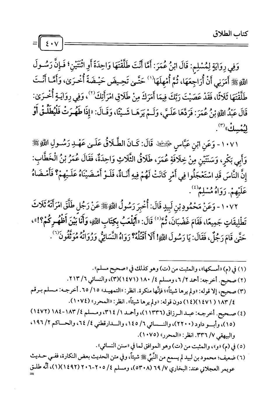 1071 - وَعَنِ ابْنِ عَبَّاسٍ رَضِيَ اللَّهُ عَنْهُمَا قَالَ: كَانَ الطَّلَاقُ عَلَى عَهْدِ رَسُولِ اللَّهِ - صلى الله عليه وسلم - وَأَبِي بَكْرٍ، وَسَنَتَيْنِ مِنْ خِلَافَةِ عُمَرَ، طَلَاقُ الثَّلَاثِ وَاحِدَةٌ، فَقَالَ عُمَرُ بْنُ الْخَطَّابِ: إِنَّ النَّاسَ قَدِ اسْتَعْجَلُوا فِي أَمْرٍ كَانَتْ لَهُمْ فِيهِ أَنَاةٌ، فَلَوْ أَمْضَيْنَاهُ عَلَيْهِمْ? فَأَمْضَاهُ عَلَيْهِمْ. رَوَاهُ مُسْلِمٌ (¬1).