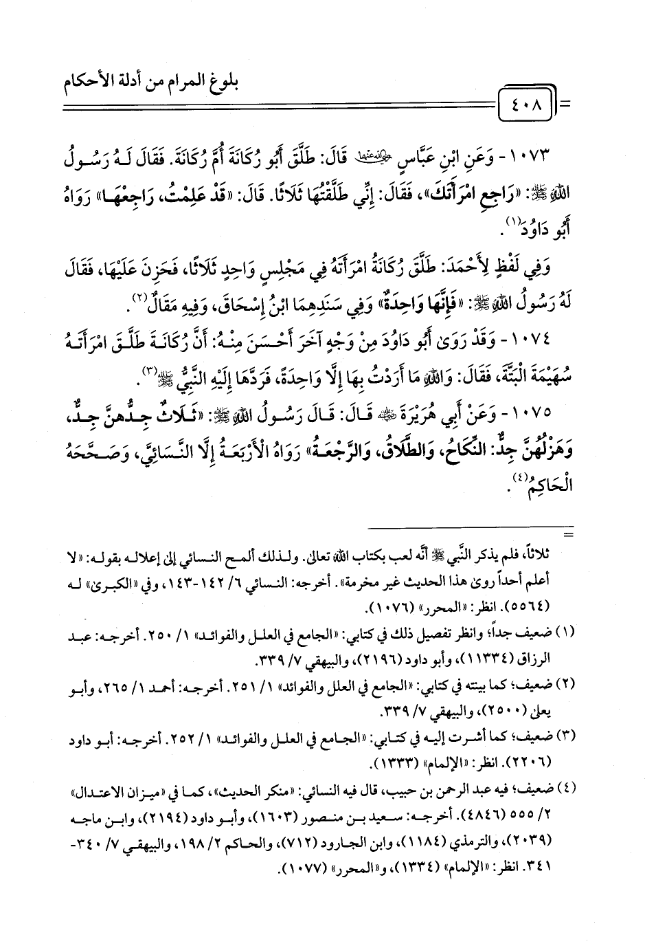 1073 - وَعَنِ ابْنِ عَبَّاسٍ رَضِيَ اللَّهُ عَنْهُمَا قَالَ: طَلَّقَ أَبُو رُكَانَةَ أُمَّ رُكَانَةَ. فَقَالَ لَهُ رَسُولُ اللَّهِ - صلى الله عليه وسلم -: «رَاجِعِ امْرَأَتَكَ»، فَقَالَ: إِنِّي طَلَّقْتُهَا ثَلَاثًا. قَالَ: «قَدْ عَلِمْتُ، رَاجِعْهَا» رَوَاهُ أَبُو دَاوُدَ (¬1).