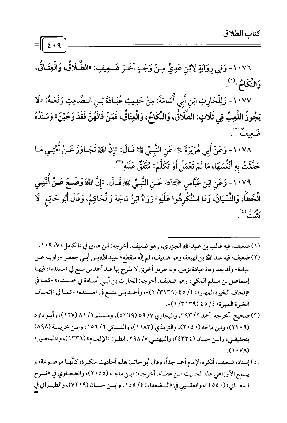 1076 - وَفِي رِوَايَةٍ لِابْنِ عَدِيٍّ مِنْ وَجْهٍ آخَرَ ضَعِيفٍ: «الطَّلَاقُ، وَالْعِتَاقُ، وَالنِّكَاحُ» (¬1).