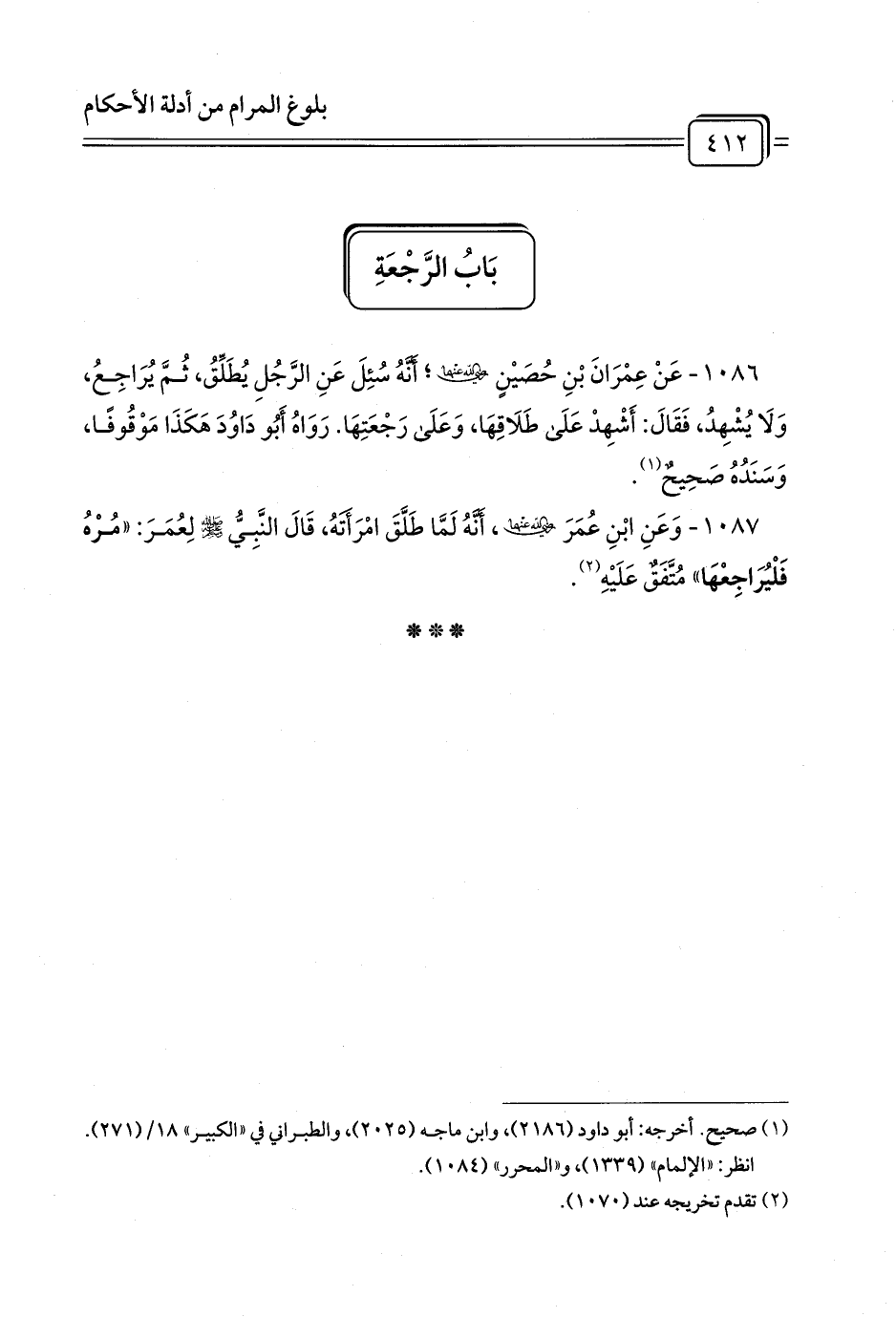 1086 - عَنْ عِمْرَانَ بْنِ حُصَيْنٍ رَضِيَ اللَّهُ عَنْهُمَا; أَنَّهُ سُئِلَ عَنِ الرَّجُلِ يُطَلِّقُ، ثُمَّ يُرَاجِعُ، وَلَا يُشْهِدُ، فَقَالَ: أَشْهِدْ عَلَى طَلَاقِهَا، وَعَلَى رَجْعَتِهَا. رَوَاهُ أَبُو دَاوُدَ هَكَذَا مَوْقُوفًا، وَسَنَدُهُ صَحِيحٌ (¬1).
