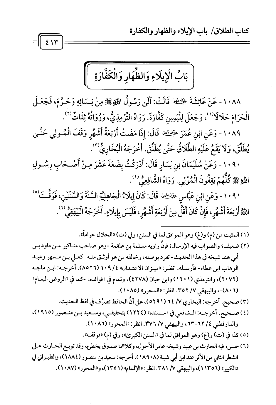 1088 - عَنْ عَائِشَةَ رَضِيَ اللَّهُ عَنْهَا قَالَتْ: آلَى رَسُولُ اللَّهِ - صلى الله عليه وسلم - مِنْ نِسَائِهِ وَحَرَّمَ، فَجَعَلَ الْحَرَامَ حَلَالًا (¬1)، وَجَعَلَ لِلْيَمِينِ كَفَّارَةً. رَوَاهُ التِّرْمِذِيُّ، وَرُوَاتُهُ ثِقَاتٌ (¬2).