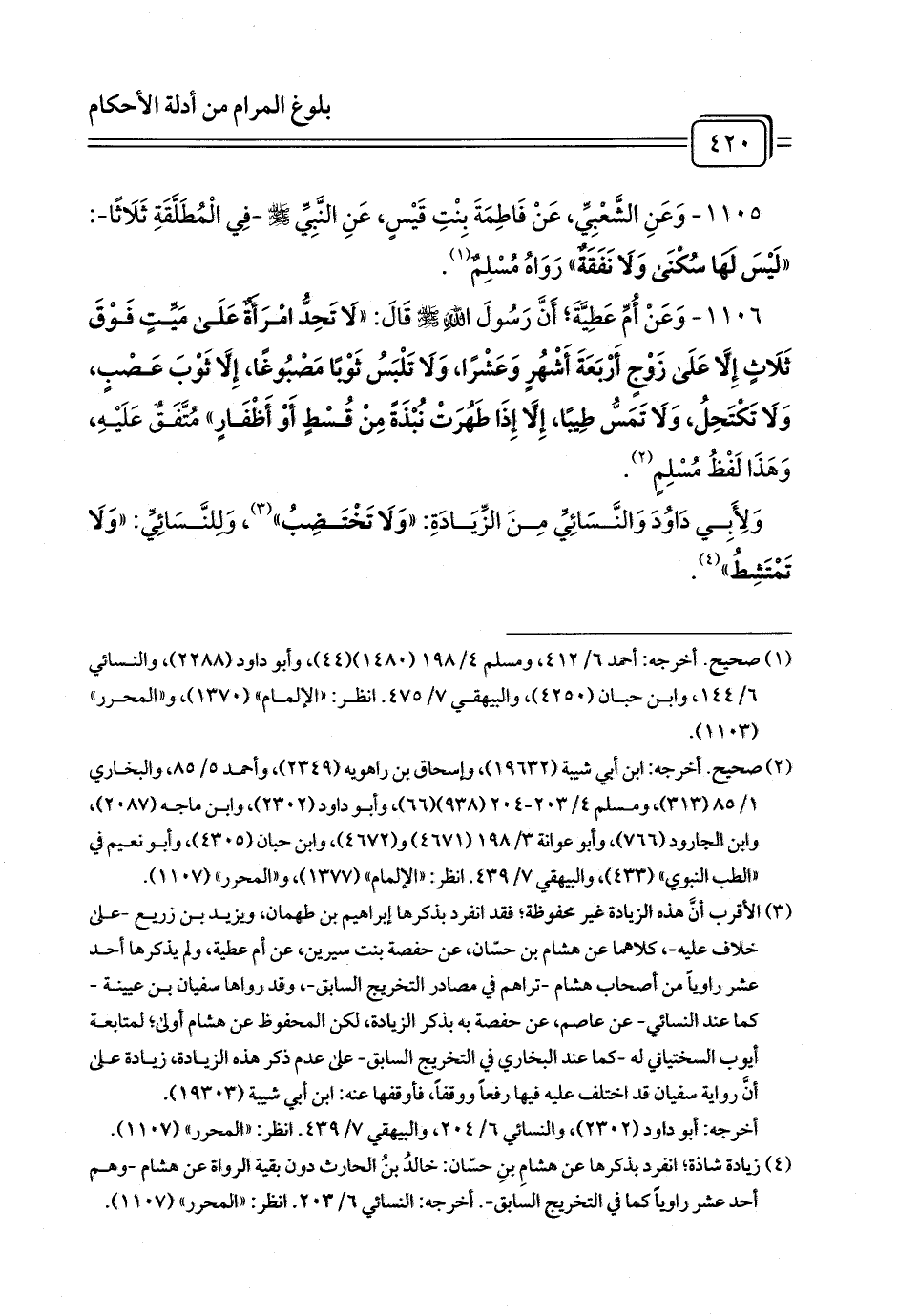 1106 - وَعَنْ أُمِّ عَطِيَّةَ; أَنَّ رَسُولَ اللَّهِ - صلى الله عليه وسلم - قَالَ: «لَا تَحِدُّ امْرَأَةٌ عَلَى مَيِّتٍ فَوْقَ ثَلَاثٍ إِلَّا عَلَى زَوْجٍ أَرْبَعَةَ أَشْهُرٍ وَعَشْرًا، وَلَا تَلْبَسُ ثَوْبًا مَصْبُوغًا، إِلَّا ثَوْبَ عَصْبٍ، وَلَا تَكْتَحِلُ، وَلَا تَمَسُّ طِيبًا، إِلَّا إِذَا طَهُرَتْ نُبْذَةً مِنْ قُسْطٍ أَوْ أَظْفَارٍ» مُتَّفَقٌ عَلَيْهِ، وَهَذَا لَفْظُ مُسْلِمٍ (¬1).