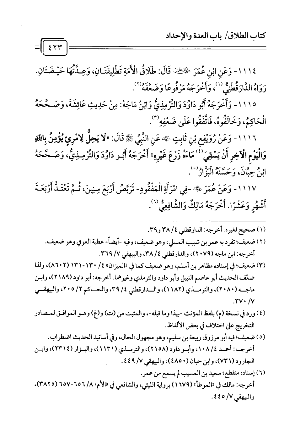1114 - وَعَنِ ابْنِ عُمَرَ رَضِيَ اللَّهُ عَنْهُمَا قَالَ: طَلَاقُ الْأَمَةِ تَطْلِيقَتَانِ، وَعِدَّتُهَا حَيْضَتَانِ. رَوَاهُ الدَّارَقُطْنِيُّ (¬1)، وَأَخْرَجَهُ مَرْفُوعًا وَضَعَّفَهُ (¬2).