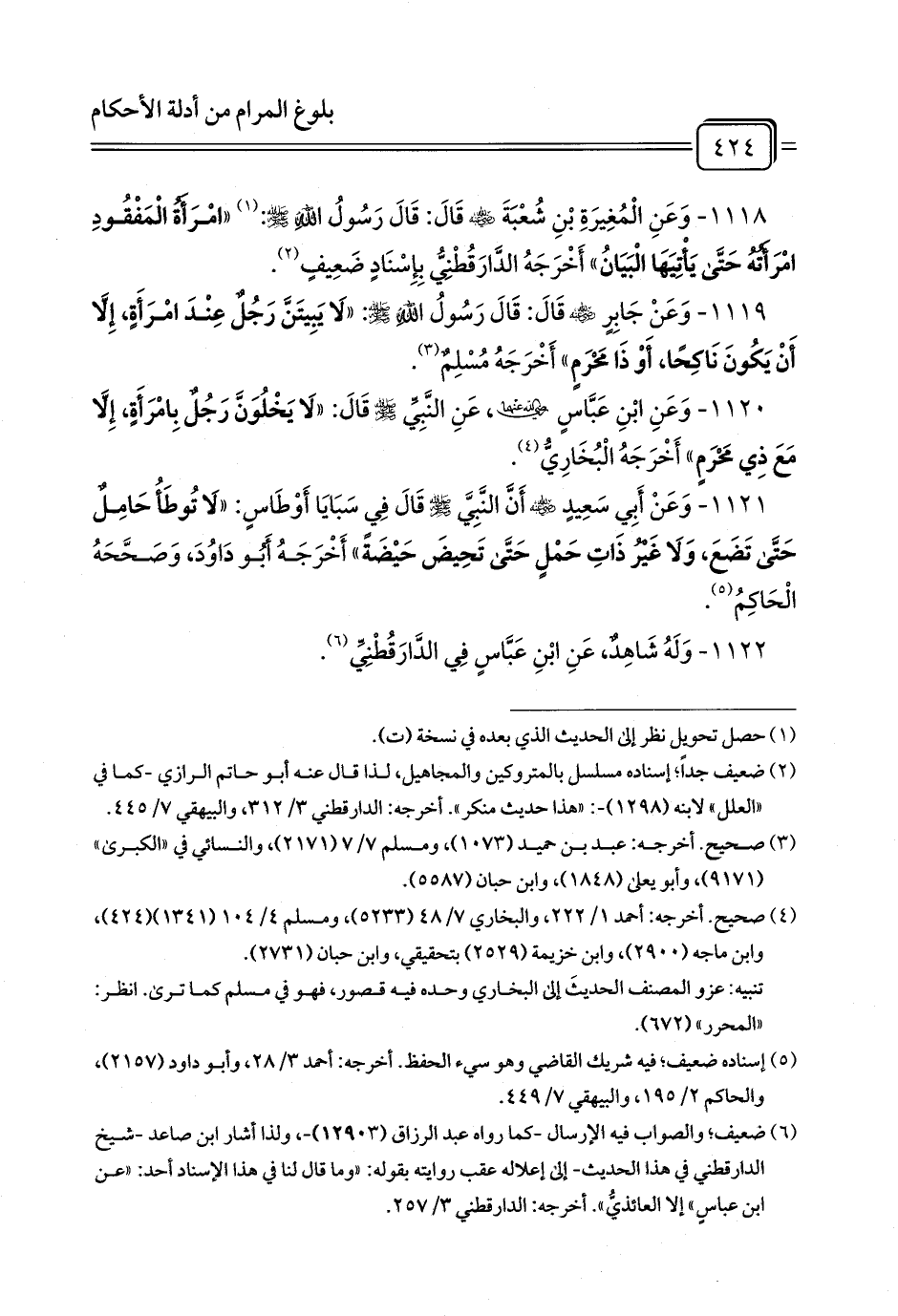1118 - وَعَنِ الْمُغِيرَةِ بْنِ شُعْبَةَ - رضي الله عنه - قَالَ: قَالَ رَسُولُ اللَّهِ - صلى الله عليه وسلم -: (¬1) «امْرَأَةُ الْمَفْقُودِ امْرَأَتُهُ حَتَّى يَأْتِيَهَا الْبَيَانُ» أَخْرَجَهُ الدَّارَقُطْنِيُّ بِإِسْنَادٍ ضَعِيفٍ (¬2).