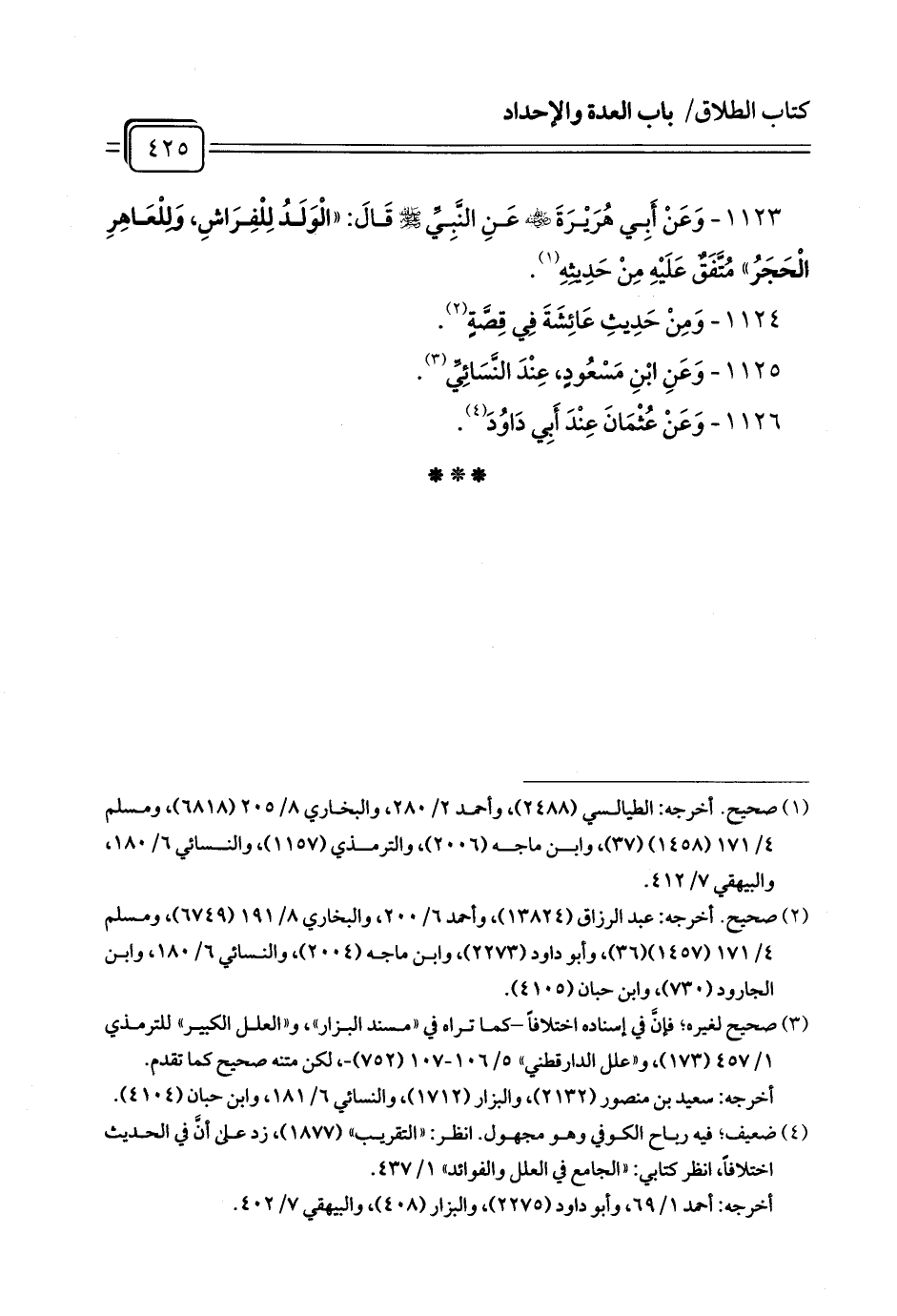 1123 - وَعَنْ أَبِي هُرَيْرَةَ - رضي الله عنه - عَنِ النَّبِيِّ - صلى الله عليه وسلم - قَالَ: «الْوَلَدُ لِلْفِرَاشِ، وَلِلْعَاهِرِ الْحَجَرُ» مُتَّفَقٌ عَلَيْهِ مِنْ حَدِيثِهِ (¬1).
