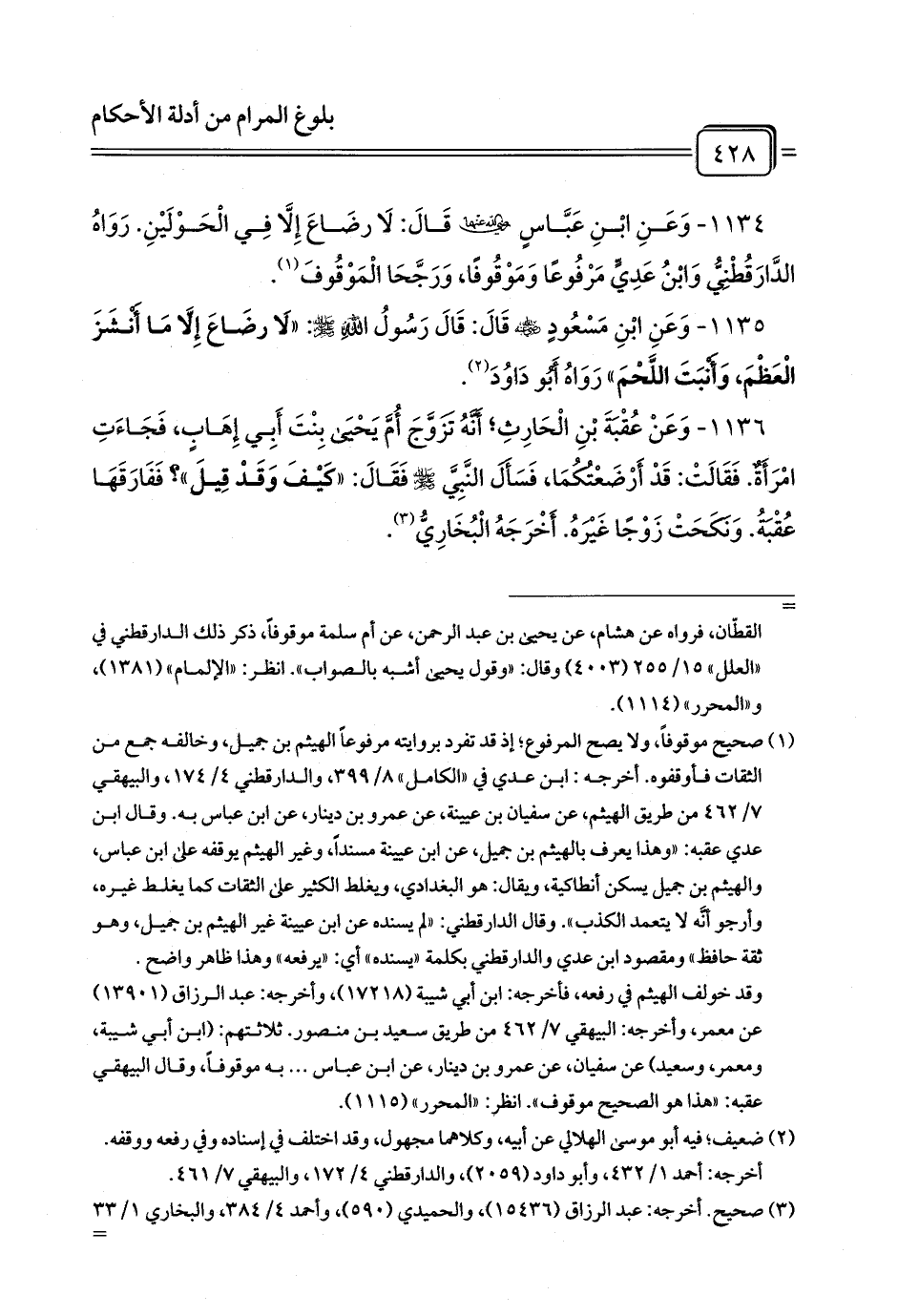 1134 - وَعَنِ ابْنِ عَبَّاسٍ رَضِيَ اللَّهُ عَنْهُمَا قَالَ: لَا رضَاعَ إِلَّا فِي الْحَوْلَيْنِ. رَوَاهُ الدَّارَقُطْنِيُّ وَابْنُ عَدِيٍّ مَرْفُوعًا وَمَوْقُوفًا، وَرَجَّحَا الْمَوْقُوفَ (¬1).